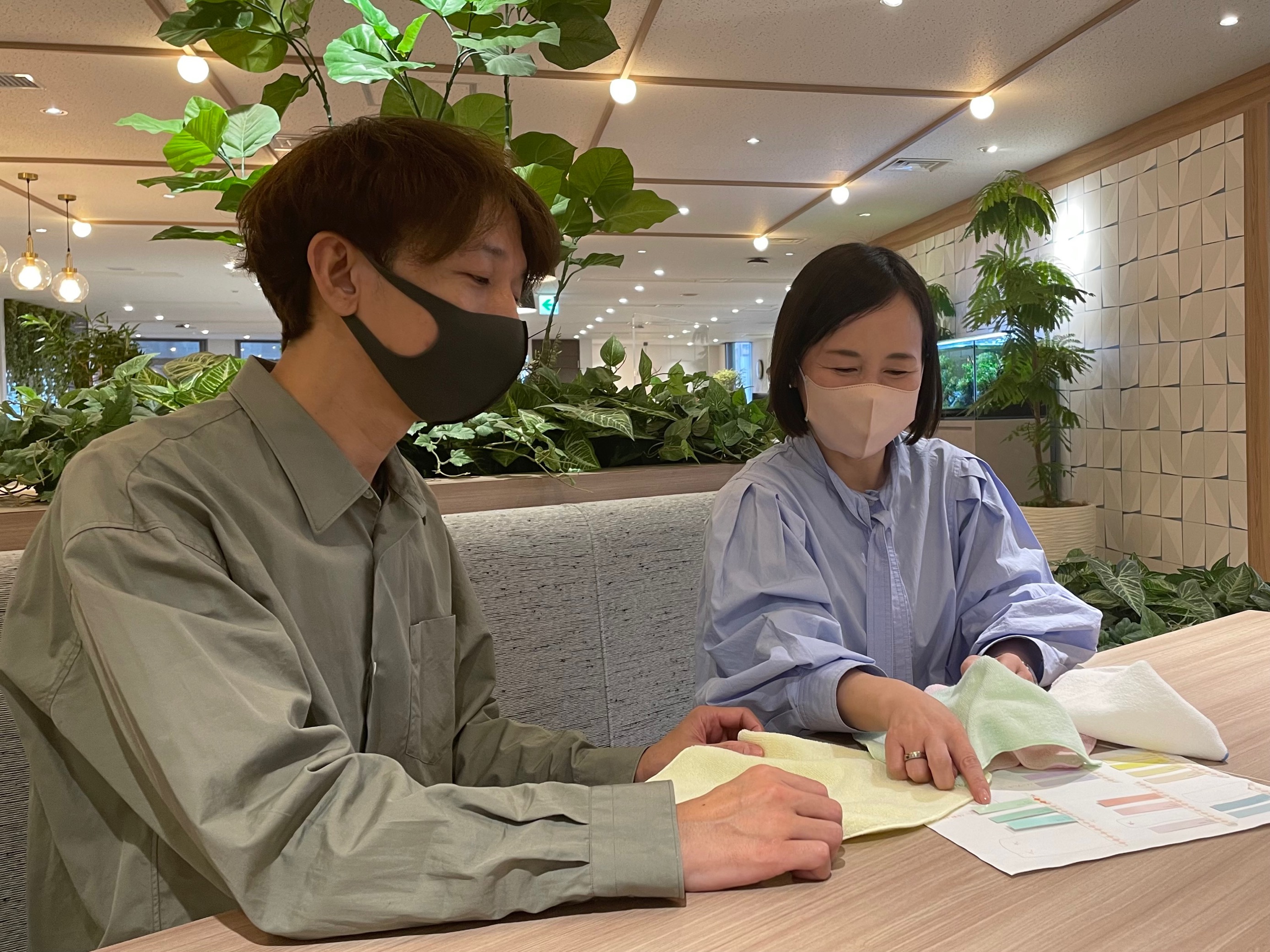 何度も何度も話し合いをしている間に、商品パッケージのイメージに合わせてハンカチのお色を考えるというアイデアに決まりました!