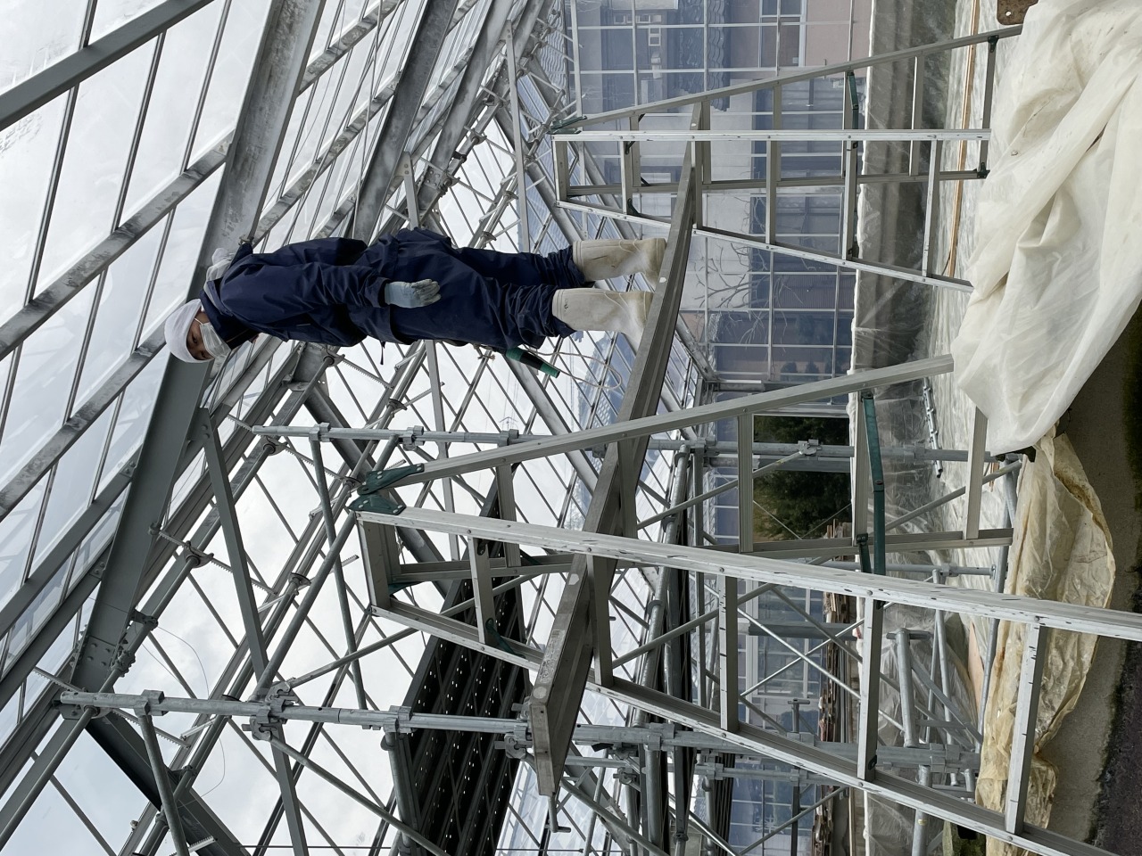 ハウス内のサビついた鉄骨にペンキ塗りをしているところでした。