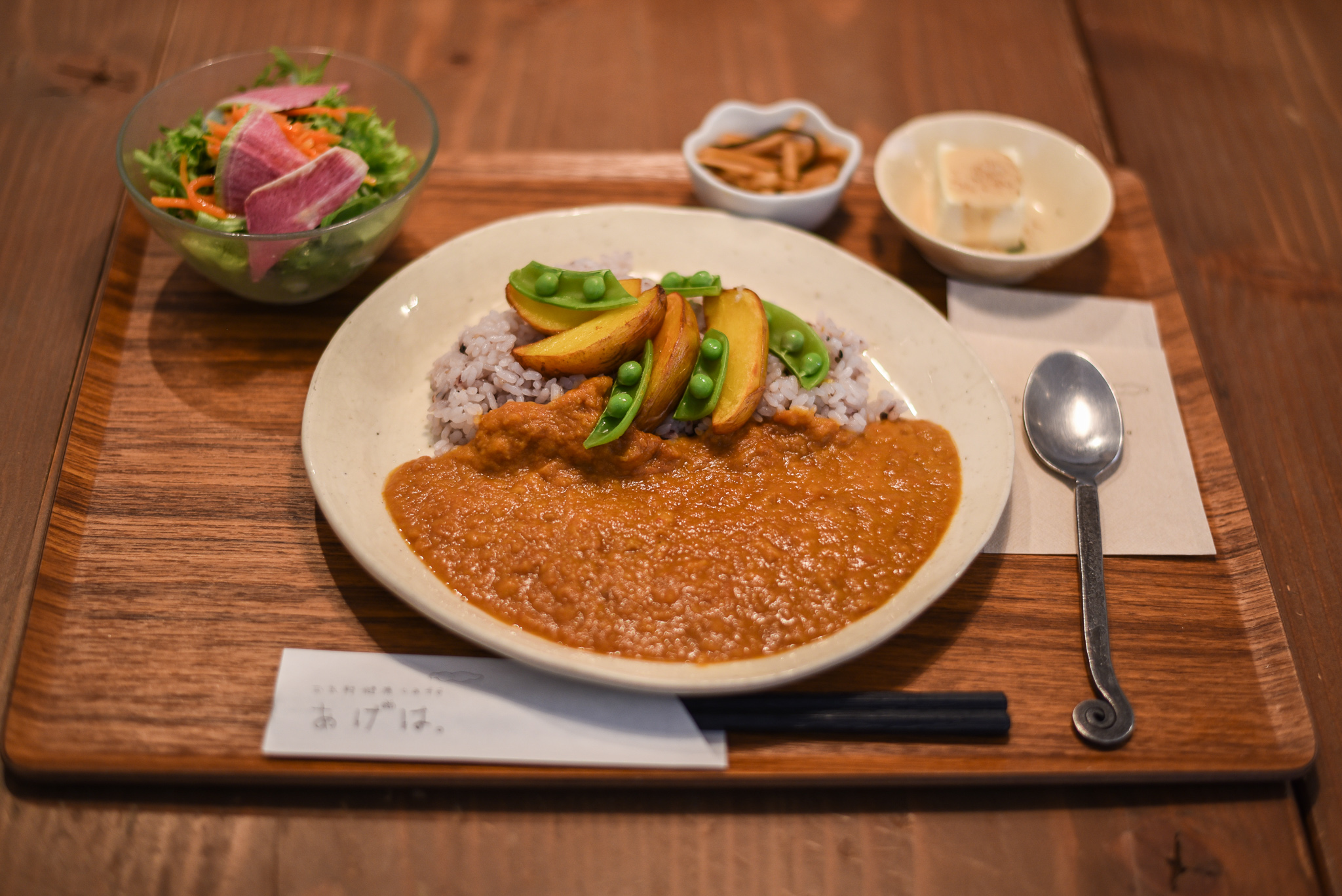 早速私は「いんかの目覚めとさやえんどうのカレー」をいただきました♪本格的なスパイスの香りが漂いますが、そこまで辛くはなく、身体が喜ぶ優しいお味です。お米は雑穀米でモチっとしていて、ルーと相性抜群♪一緒についてくるサラダもシャキシャキで新鮮なのが伝わりました。