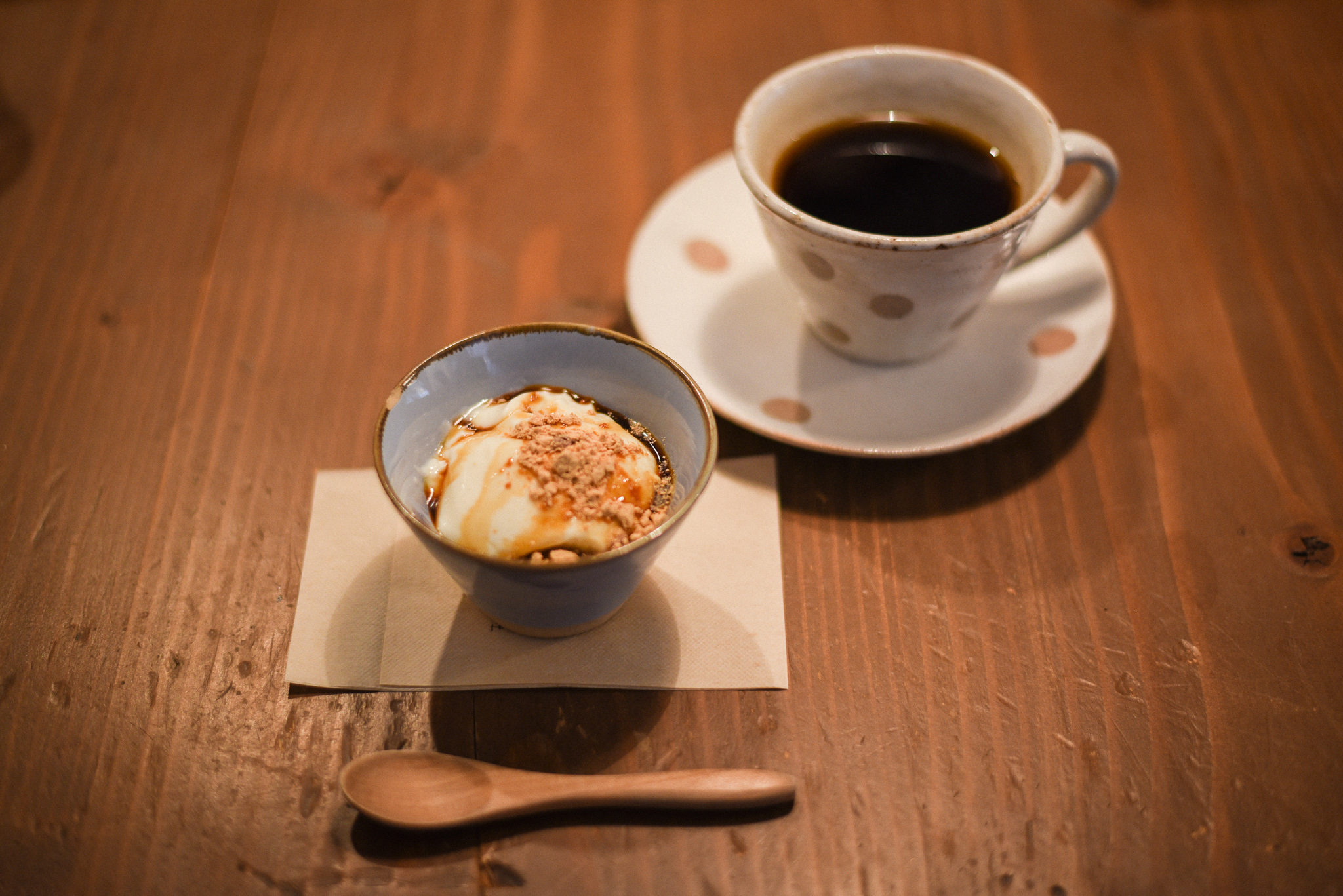 デザートの「豆乳プリン」は、お好みの量の黒蜜をかけて♪甘すぎずやさしい甘さで、歩いて疲れた体中にほのかな甘みが広がります。一緒に運ばれてきたコーヒーも美味しく、落ち着く空間も相まって「ずっとここにいたい…。」とポロっと言ってしまいました(笑)