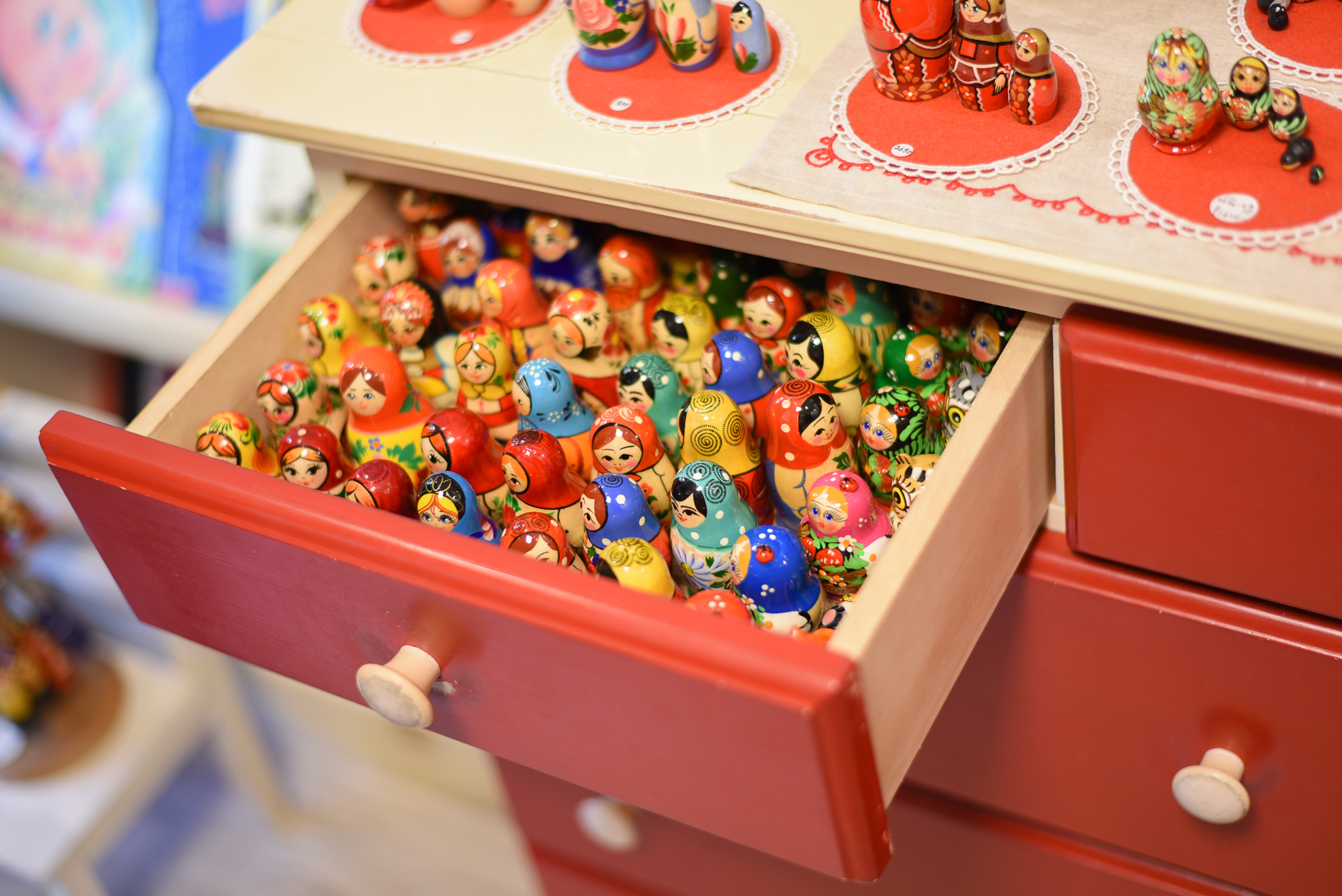 いろいろ店内を見ていると、なんと棚や引き出しにもたくさん「マトリョーシカ」や雑貨が!!楽しく商品選びができるように工夫されています。次の引き出しは何がはいっているのか…?わくわく(#^.^#)