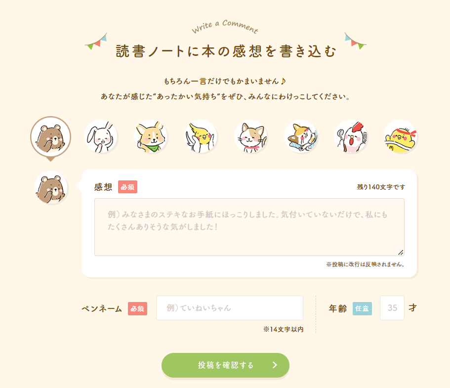 好きな動物のキャラクターを選んで、思い思いの感想をお寄せください♪