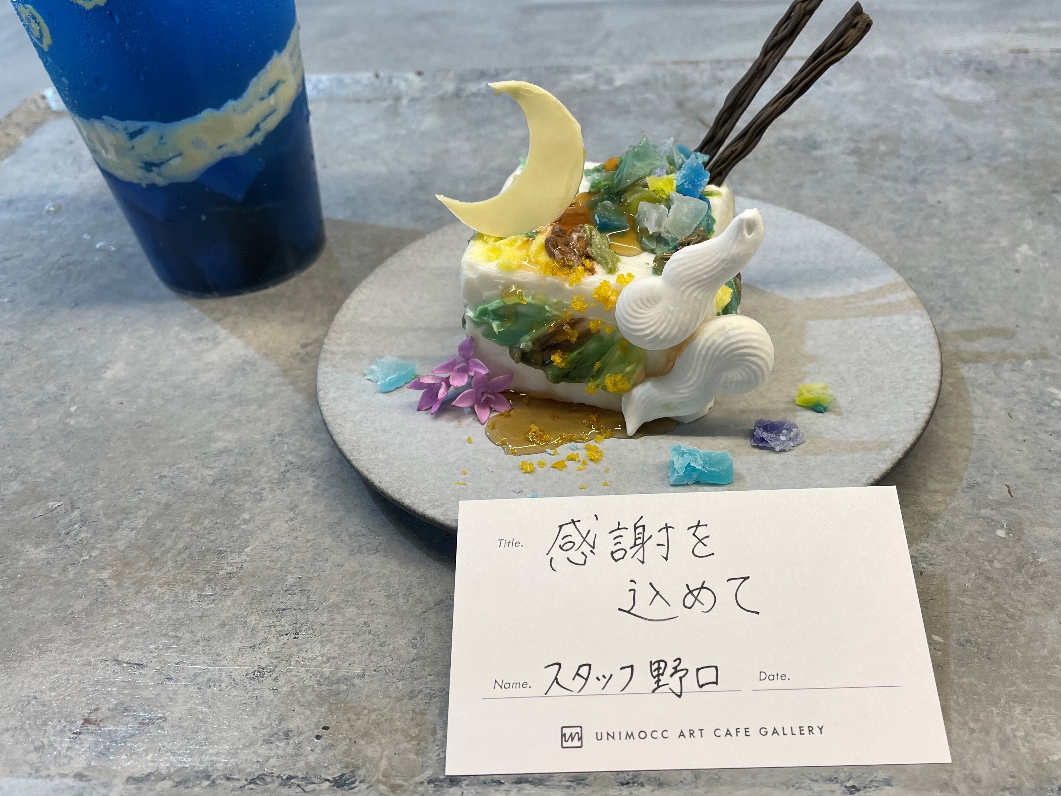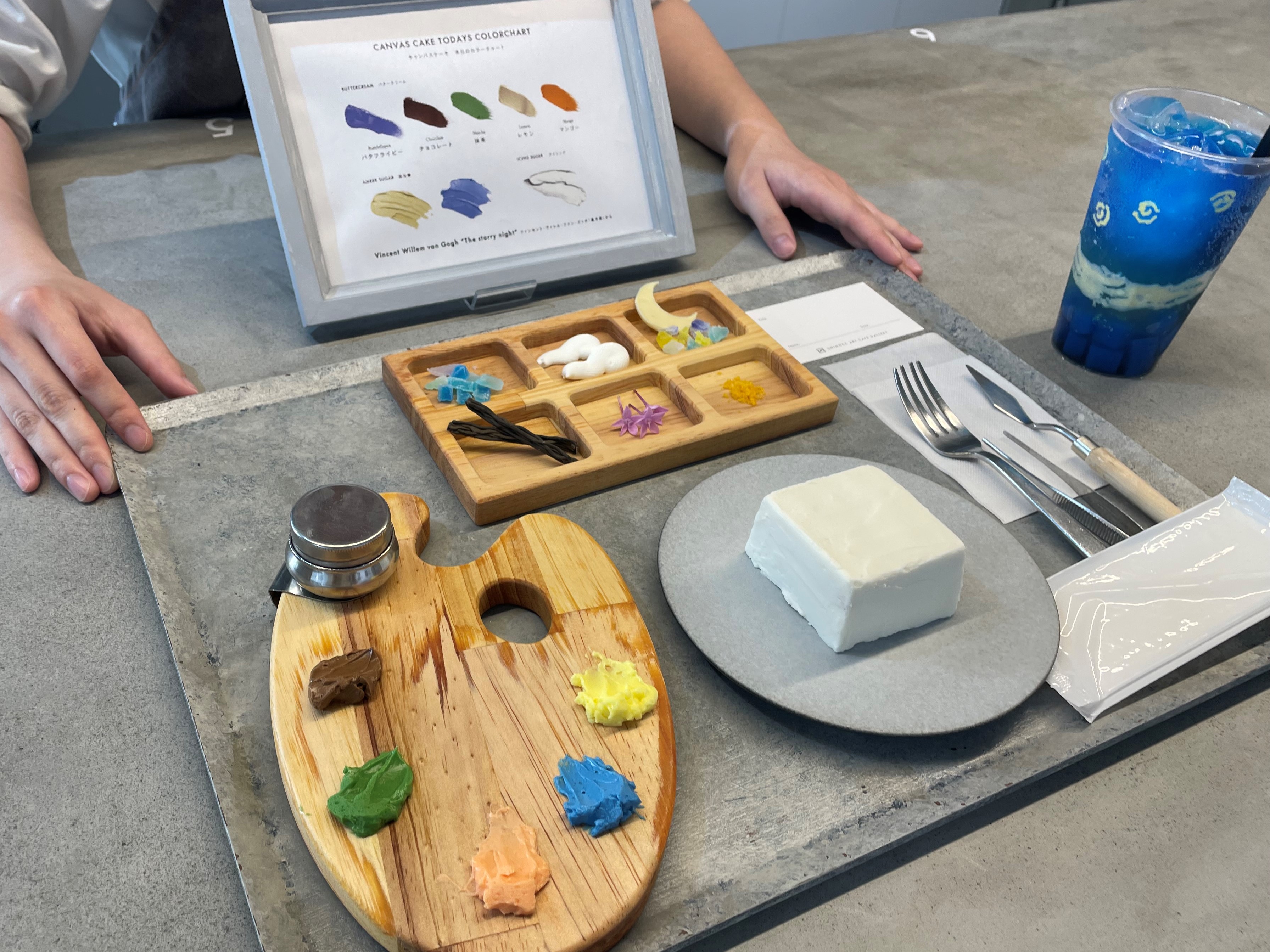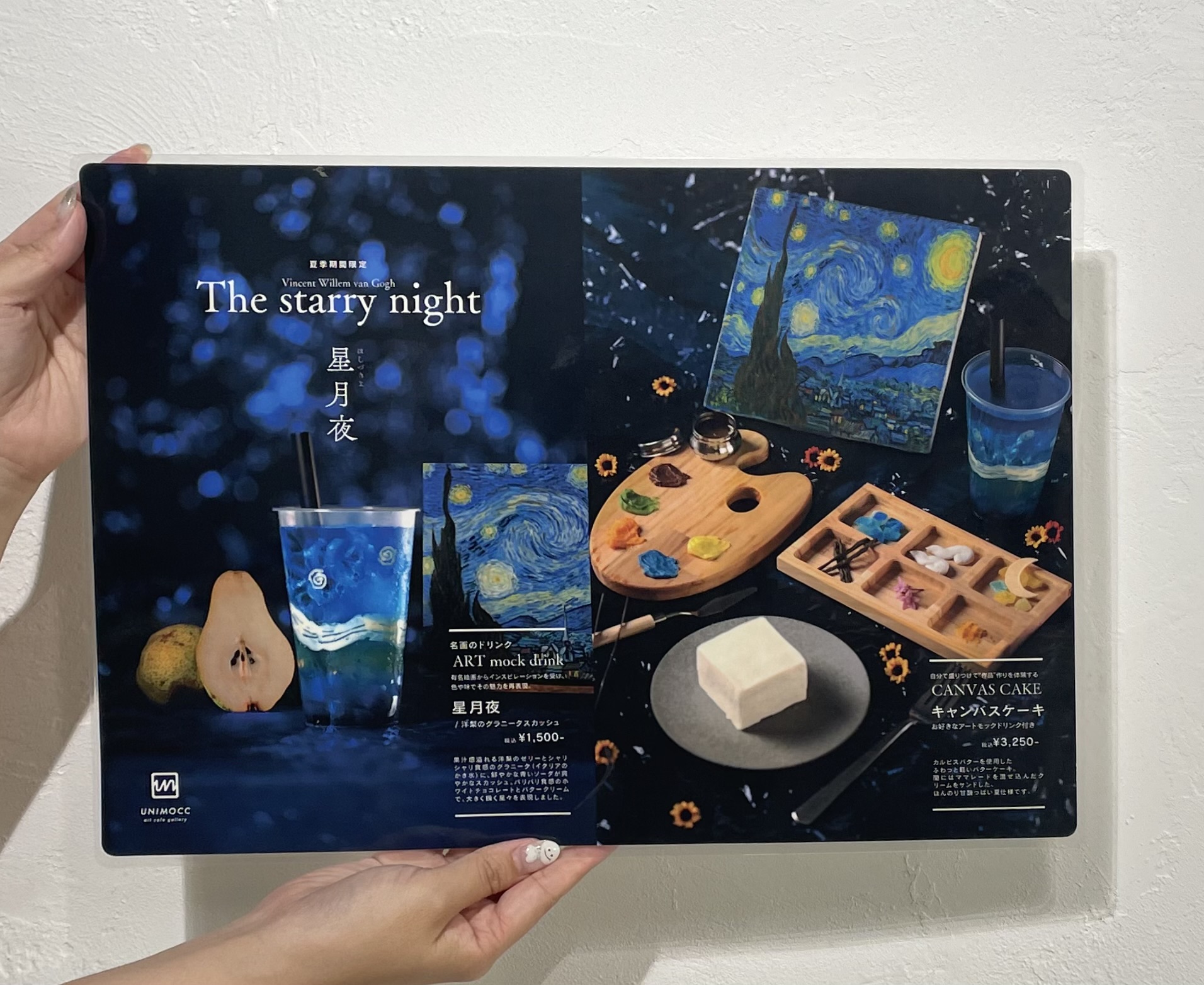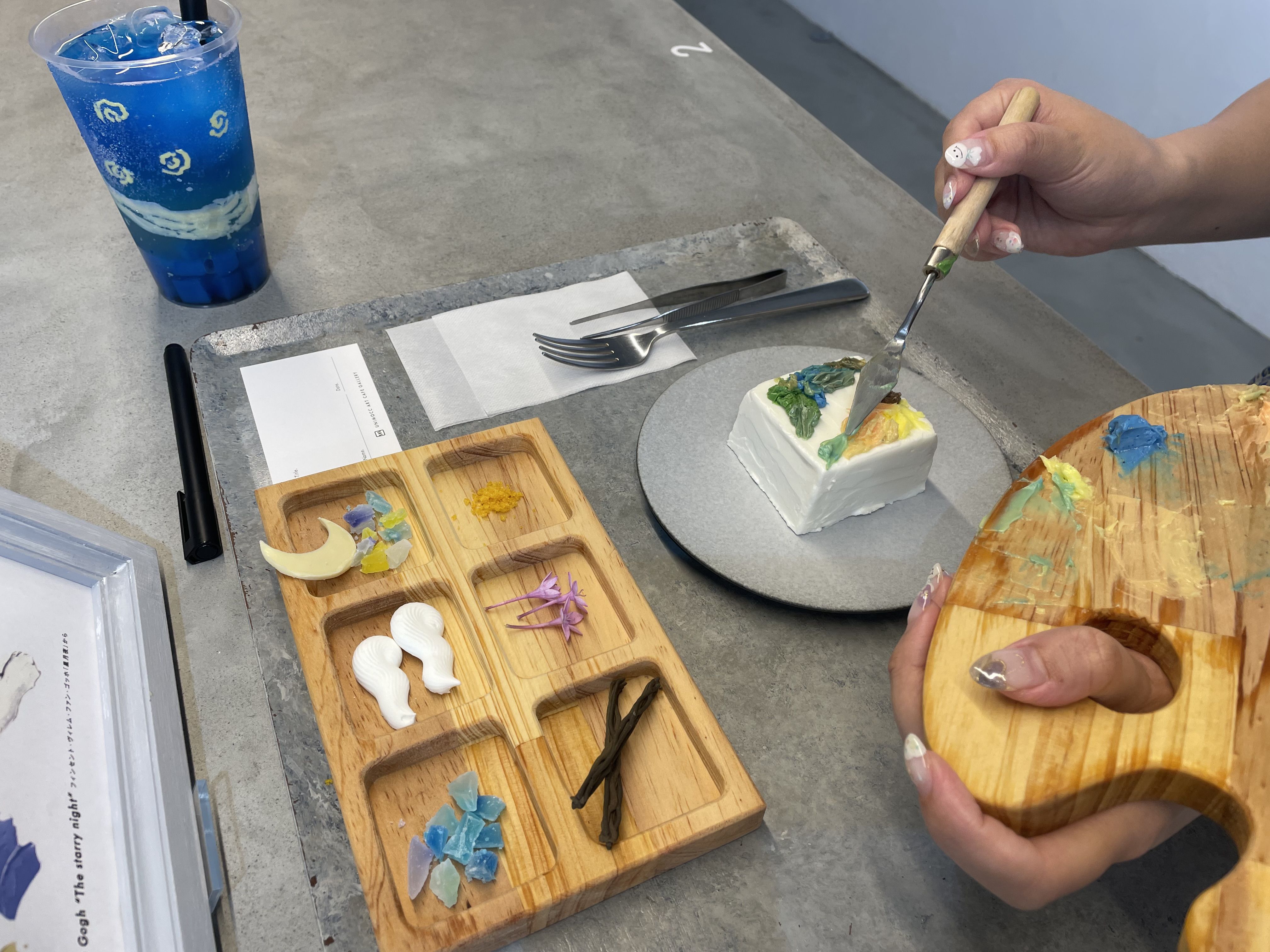 今回私たちは、期間限定(7・8月)で星月夜仕様の「キャンバス・ケーキセット(ドリンク付き)」と名画をモチーフにした「アートモックドリンク」を注文しました。