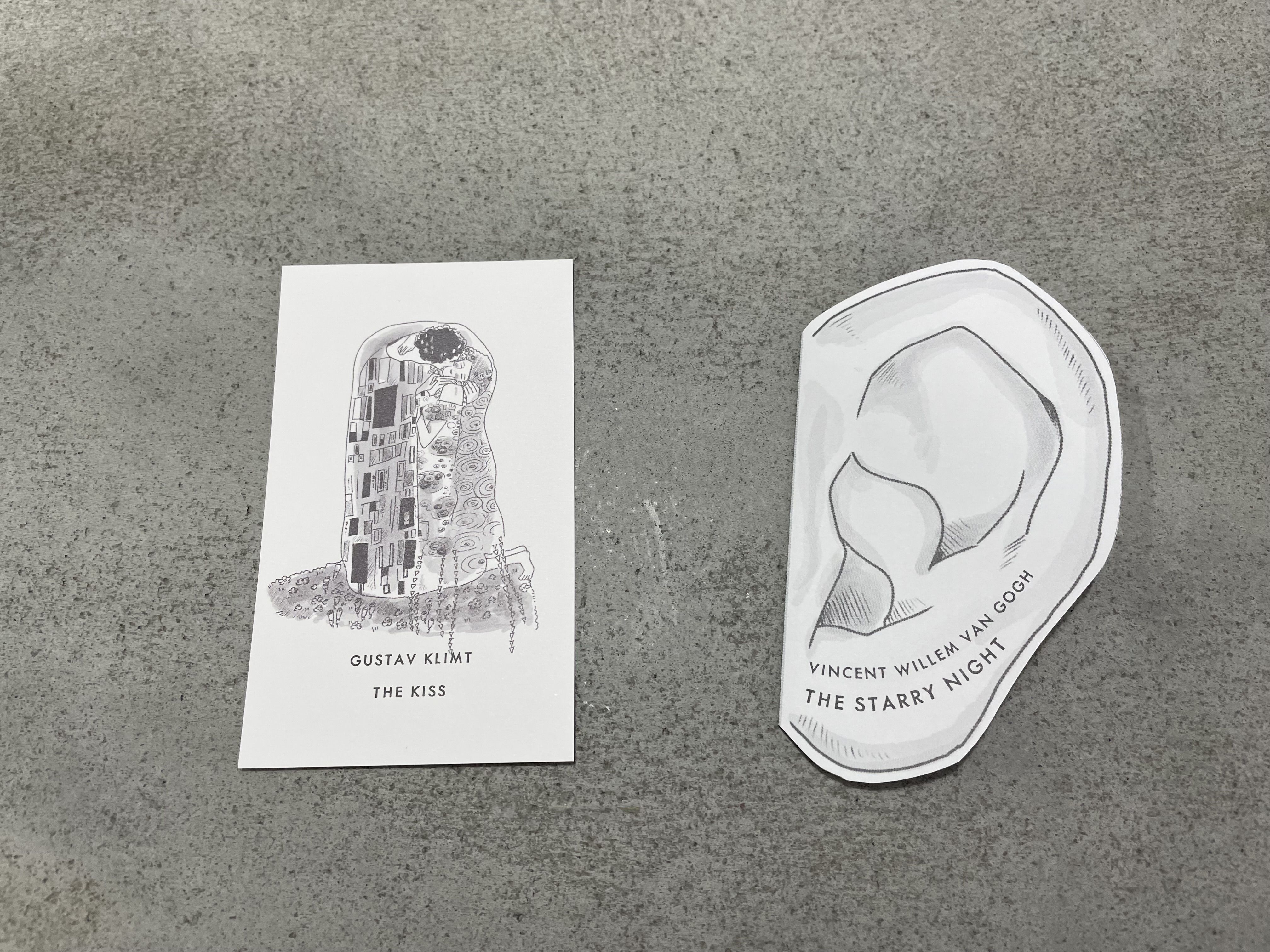 左から「接吻」、「星月夜」のドリンクカード。ゴッホは耳切事件があったことから、耳の形になっていました。