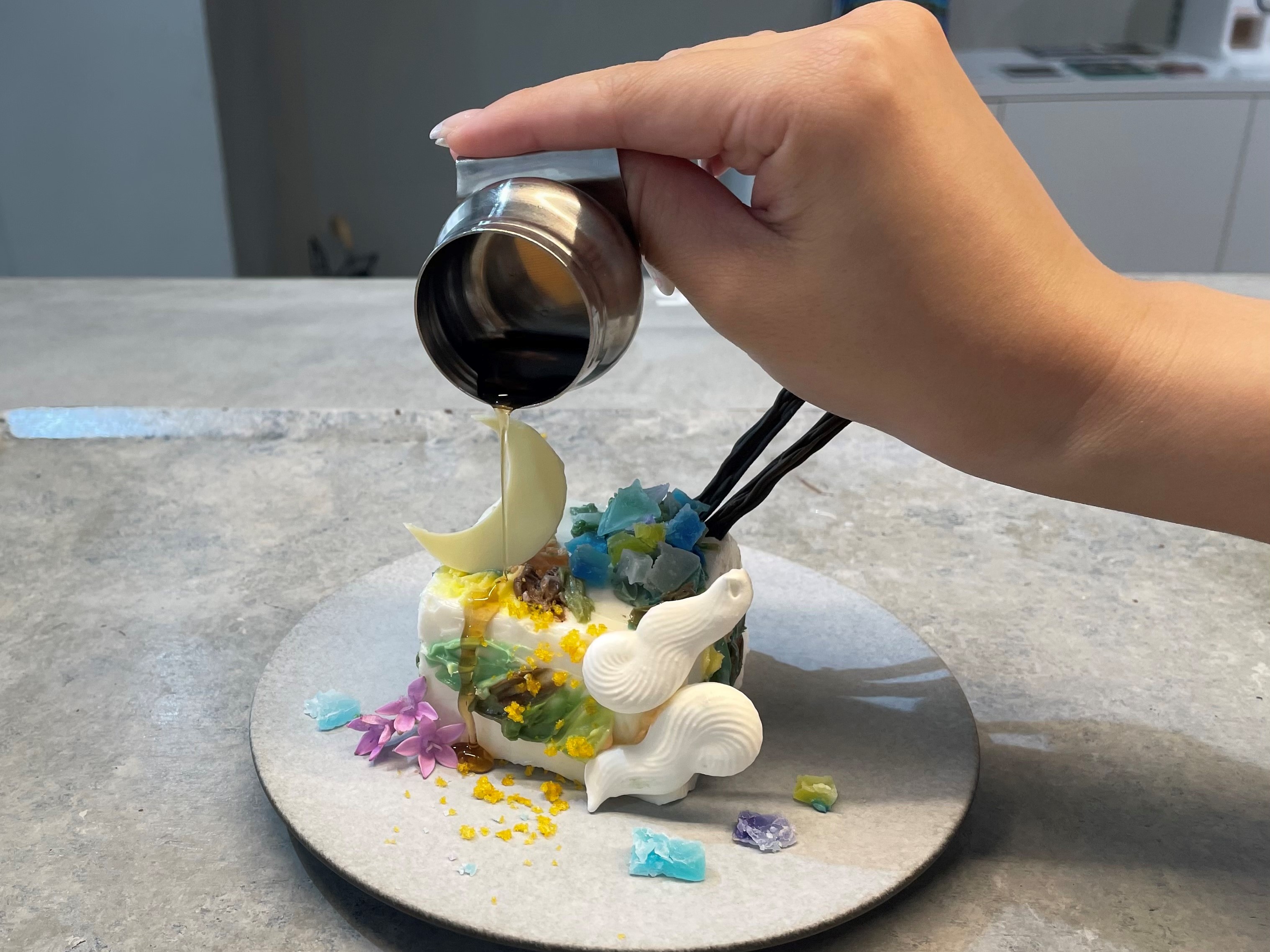 シロップを凍らせて作る“グラニータ(イタリアのかき氷)”が入ることでシャリシャリ食感が楽しめ、“キューブ状の洋梨のピューレが入ったゼリー”と“洋梨のシロップが入ったジューシーなゼリー”で、絵画に描かれている建物1つ1つを表現。