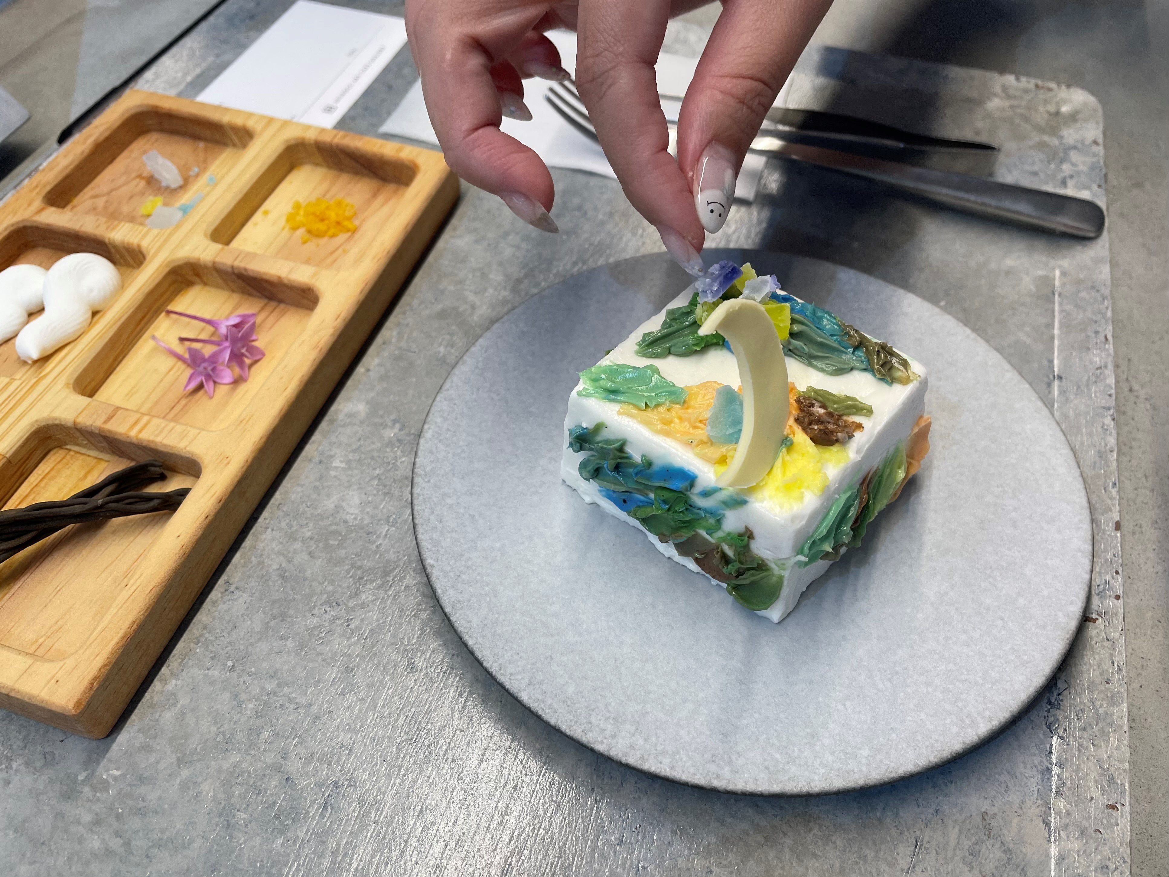 左下から「パレットの上に油絵の具に見立てた“バタークリーム”と油壷の中には絵の具を溶かす油に見立てた“メープルシロップ”」、「標本箱に入った“トッピングパーツ”」、「キャンバスに見立てた真っ白な“バタークリームケーキ”」