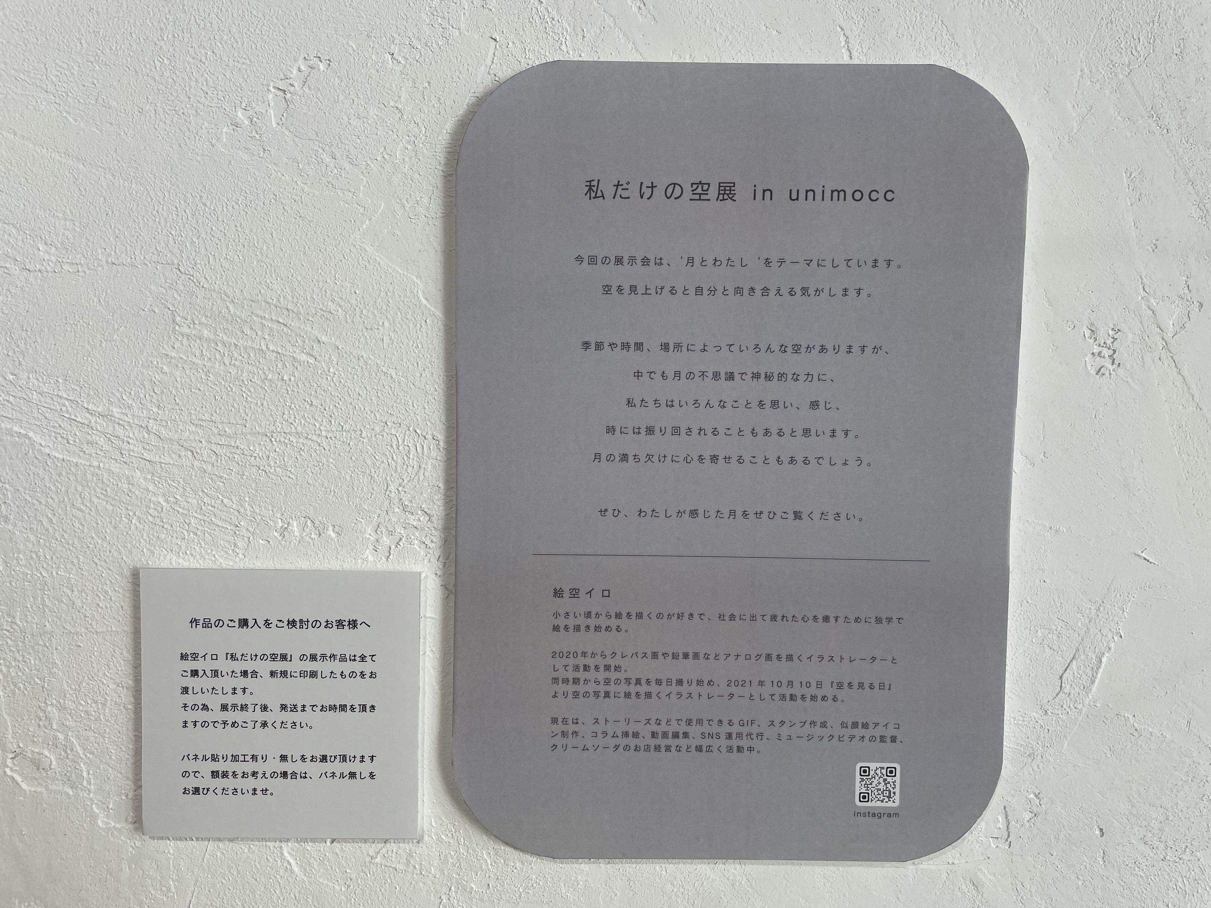 7月上旬に訪れたのですが、その日は【私だけの空展】の期間中で、「月」をテーマにした空の作品たちが展示されていました。短いときは2週間・長いときは1ヵ月ほどで作家さんが入れ替わるため、足を運ぶたびにいろんな作品と出会えます♪