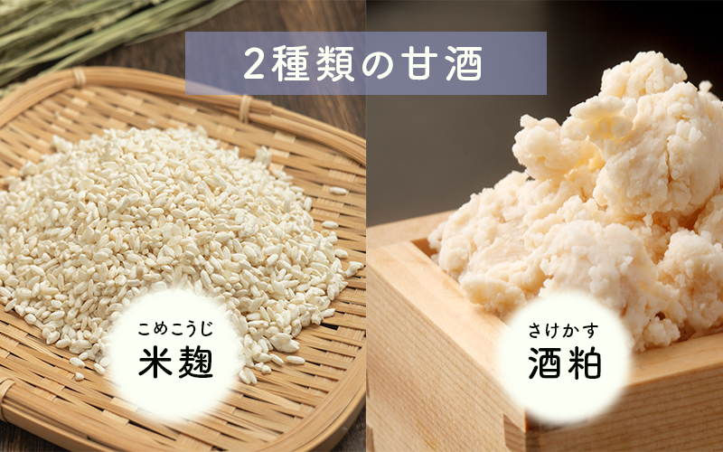 甘酒には大きく分けて、2種類あります。米麹を発酵させて作る「麹甘酒」と、日本酒を作る工程でできる酒粕を使う「酒粕甘酒」です。2つの味は似ていますが、甘さの出し方が違います。麹甘酒は発酵させた自然由来の甘さ、酒粕甘酒は砂糖を加え飲みやすい甘さをしているのが特徴です。