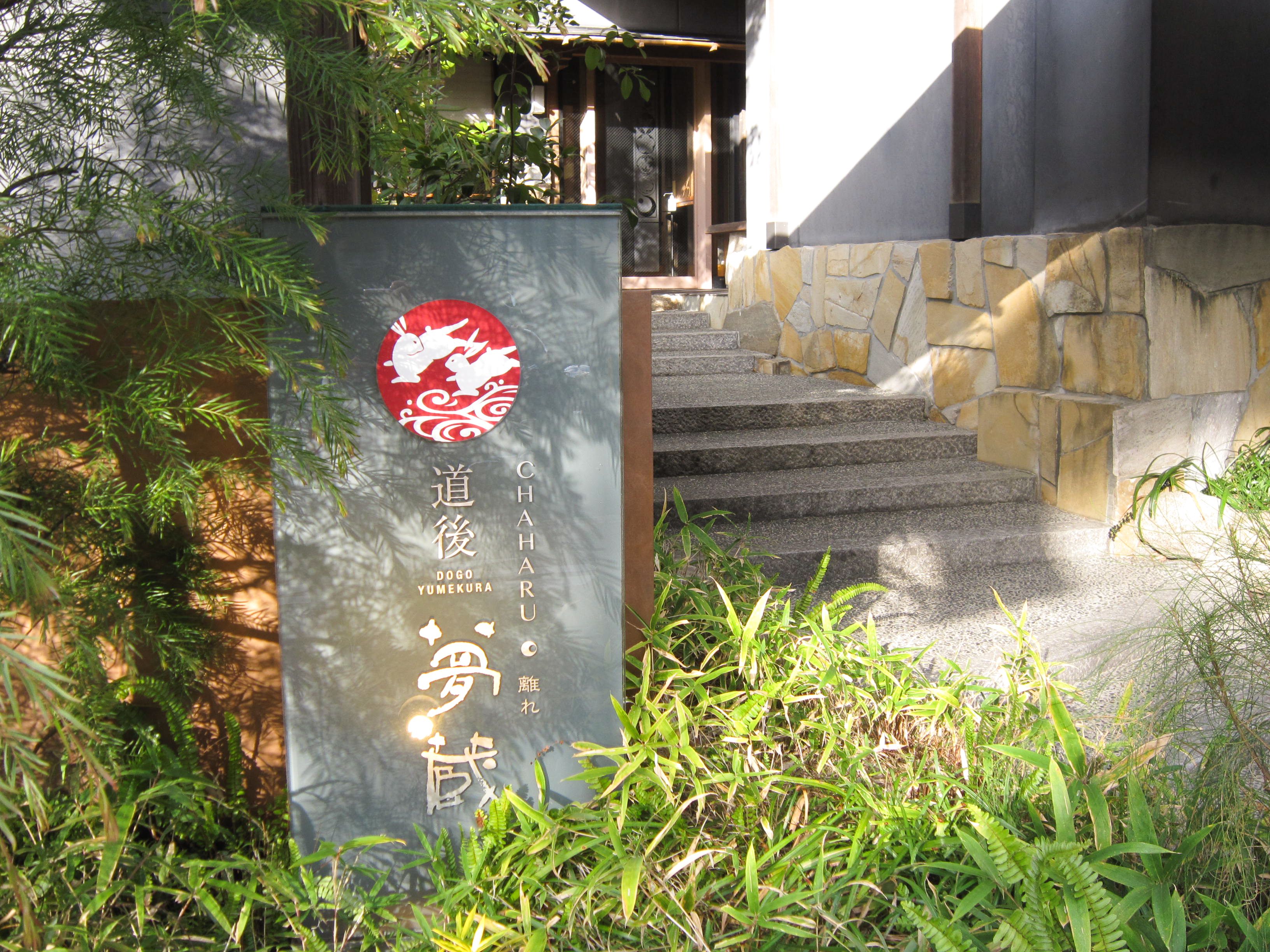 道後温泉本館の東面入口が向かいにあり、商店街も近くとても立地の良い場所にあります。 部屋の入口から見えるいつもは皇室専用となっている東面入口。この時は正面が改装中とのことで、特別にこちら側から入浴ができるようで、たくさんの方でにぎわっていました。CHAHARU離れ 道後夢蔵は愛媛の風情を伝える地産地消のお宿。お部屋、お料理など節々にそれを感じ取ることができましたので、ご紹介します。