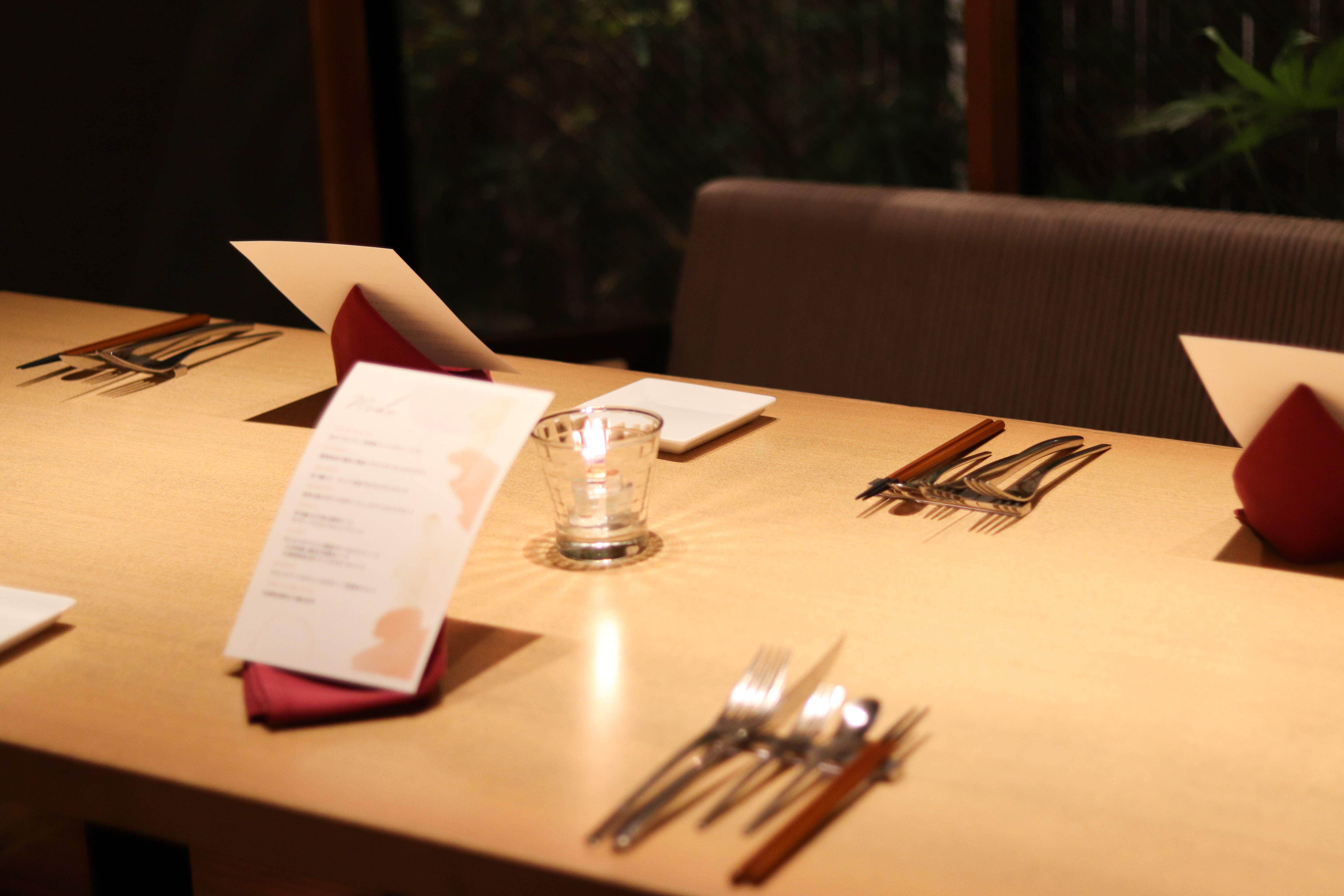 内風呂だけでなく露天風呂もあり、蛇口からは温泉が。道後温泉のある町中を見下ろしながら入る温泉は最高でした。 そして用意されているタオルはすべて今治タオル。 厚みのあるふかふかしたタオルが肌に優しくて心地いいです。吸水性もばっちり! 夕食は、個室でいだけるフレンチ。始終御縁がありますよう想いを込めたという、Quatre-Cinq(キャトル サンク)さん。建物の2階にあるので移動もスムーズです。