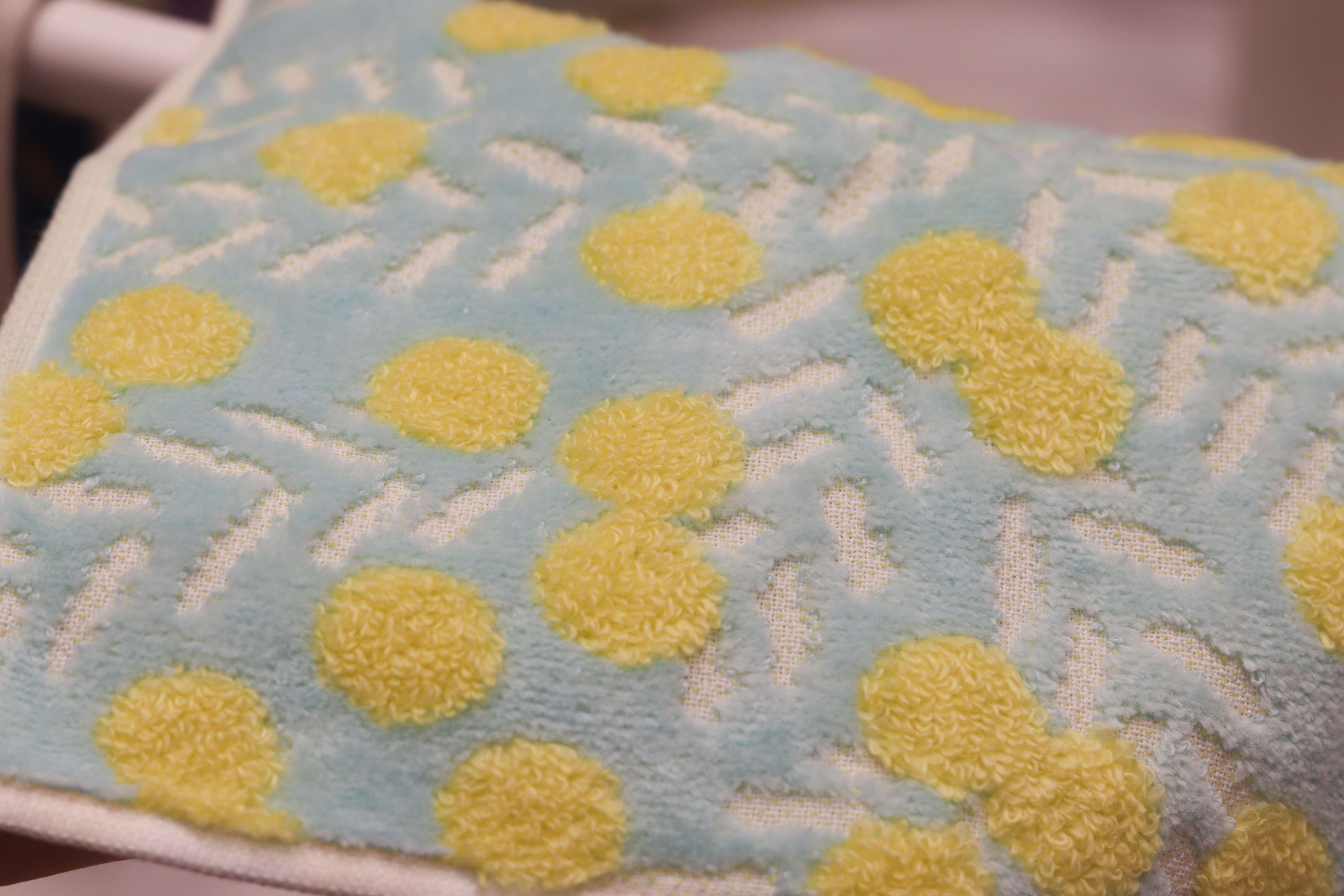 表と裏で違う表情をみせてくれるのも魅力的。ジャカード織りというタオル地に凹凸のある織り方によって、花びらが浮き上がるような仕上がりに。 実際のミモザを思わせるふわふわの肌触りはデザイン性の良さだけでなく、機能性も◎細かいデザインは昔からの職人技からなされます。