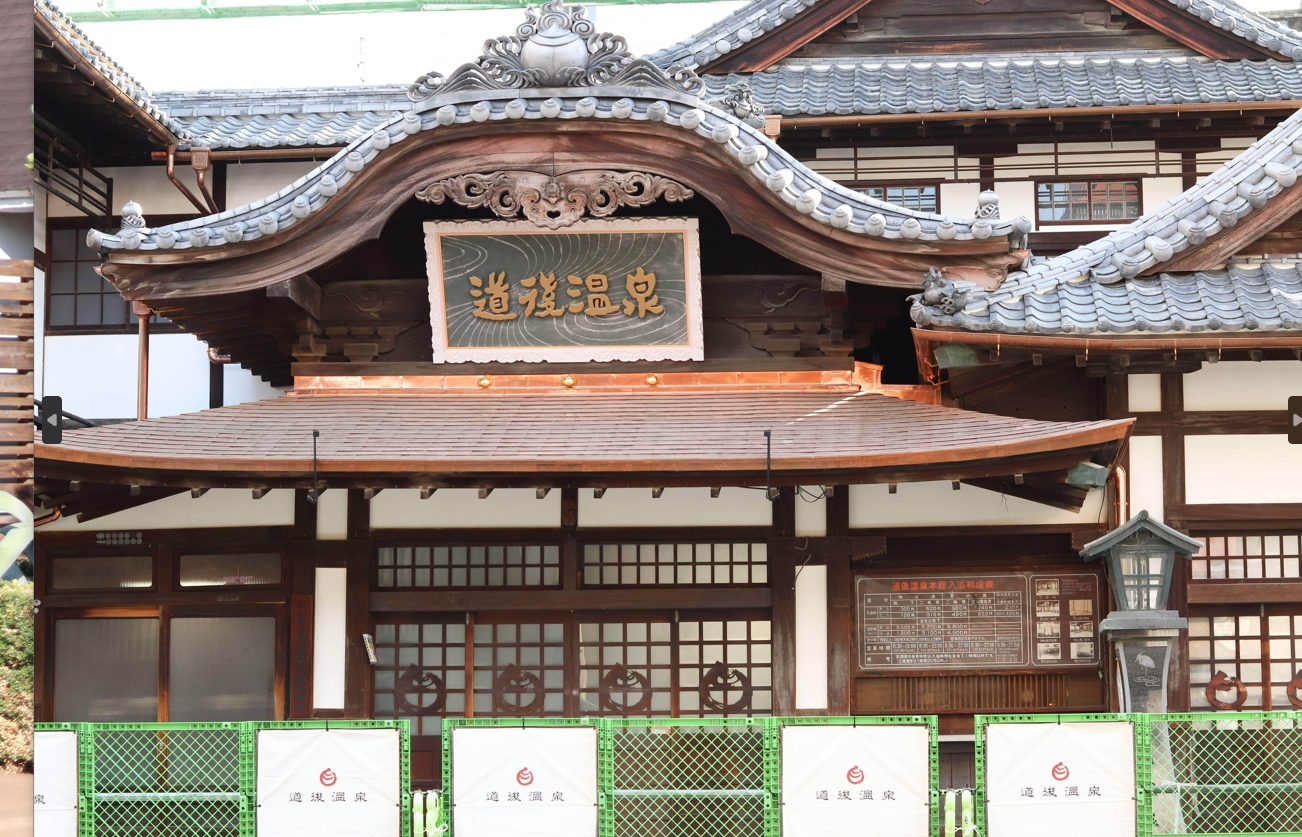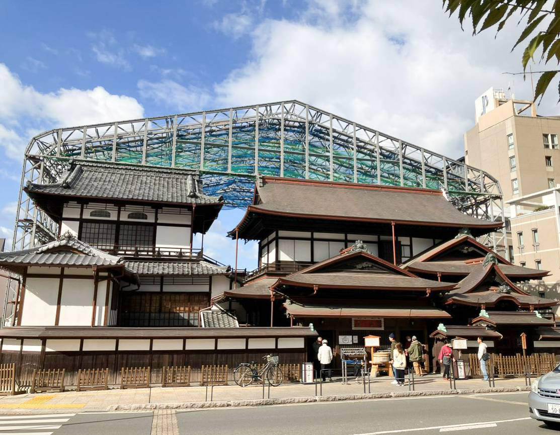 私たちが訪れた時は保存修理工事中!なんと、平成31年(2019年)1月15日に開始し、2024年(令和6年)12月までの予定だそう。長い時間をかけてていねいに行う保存修理工事。改築130年を迎える建物を、次の世代へ受け継いでいくため必要なことなんですね。この保存修理工事時期はなんと東側から入浴できるそうです。