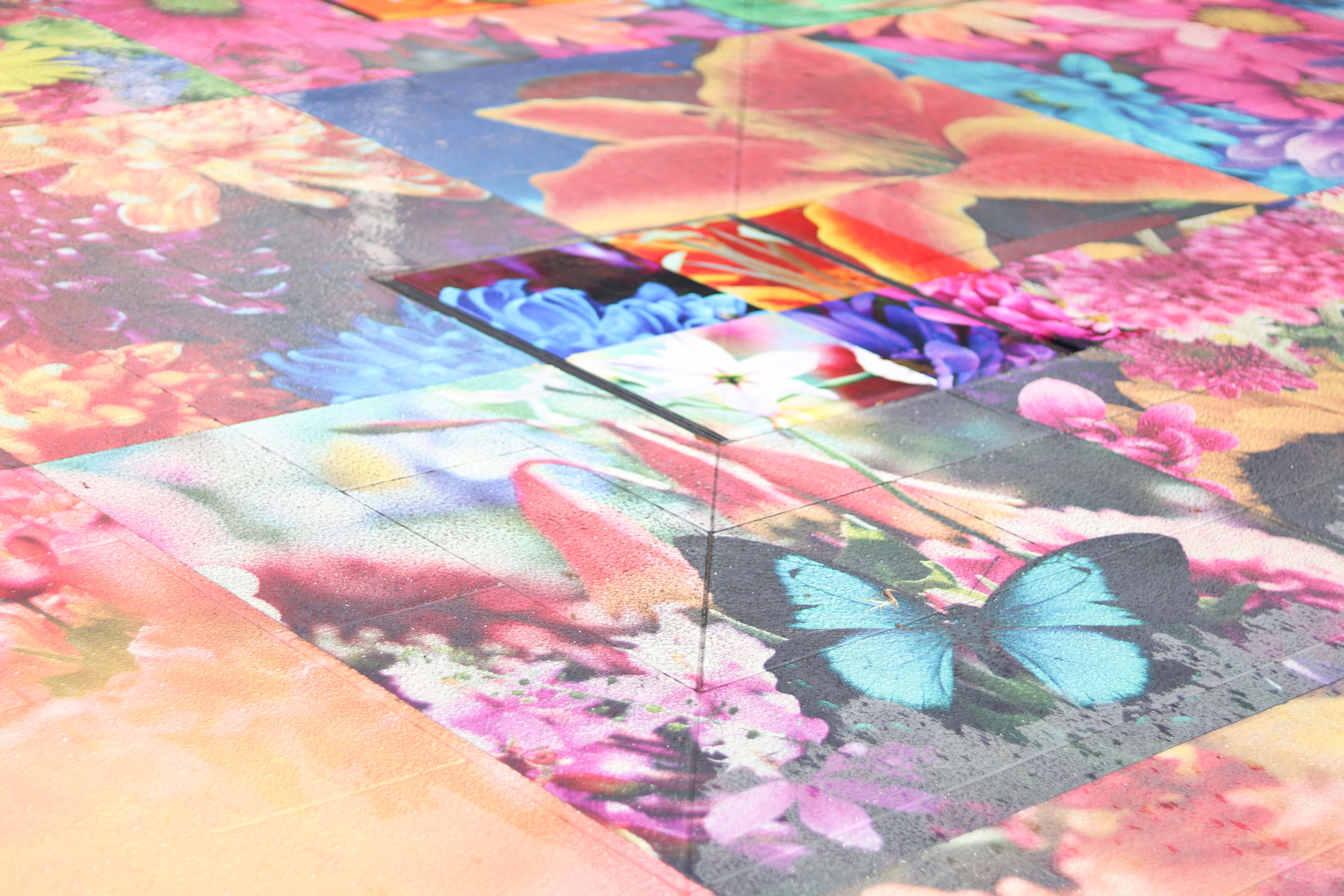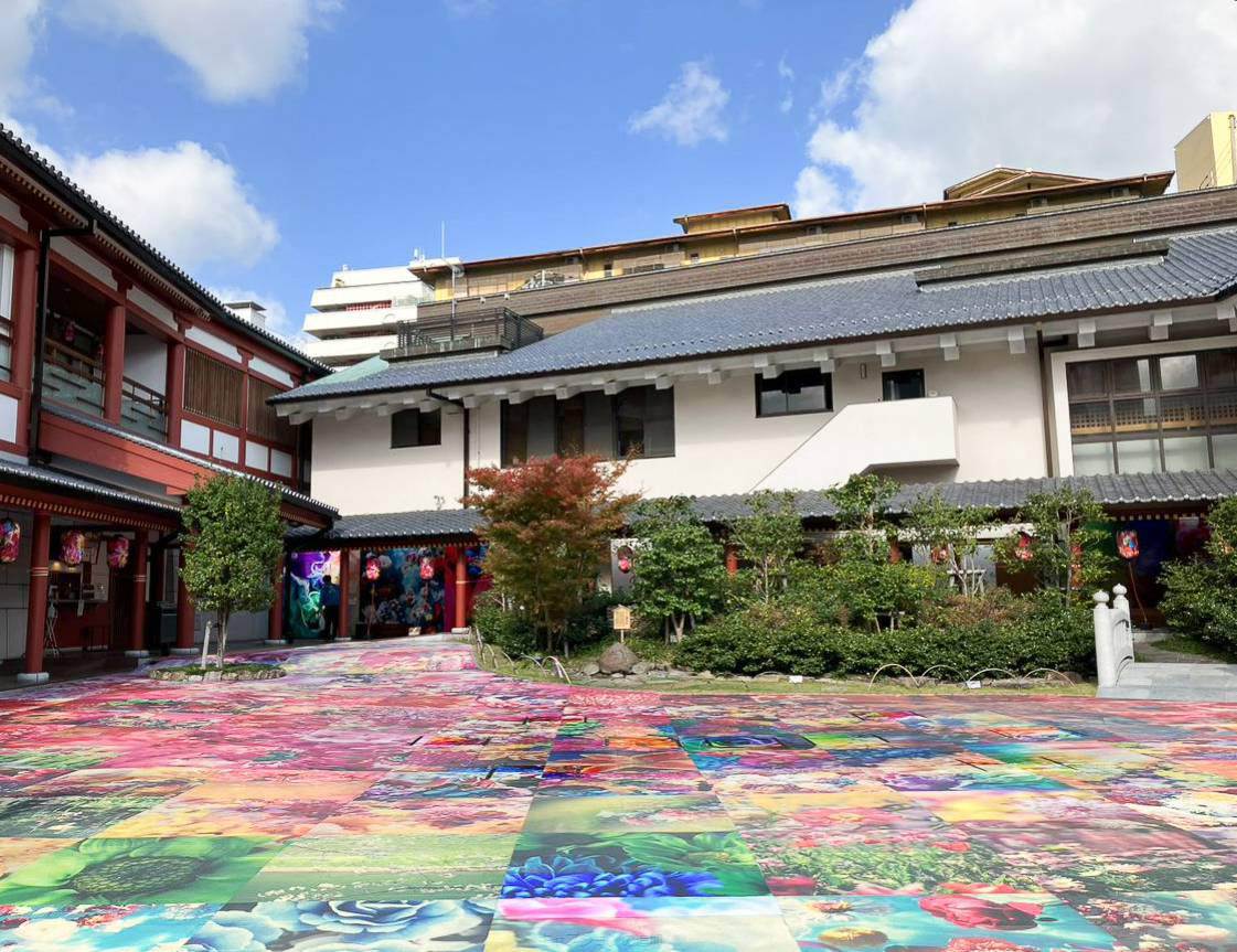中庭の「飛鳥乃湯泉インスタレーション」は圧巻。写真家・映画監督の蜷川実花さんによるもの。約230点の花の写真が敷き詰められています。