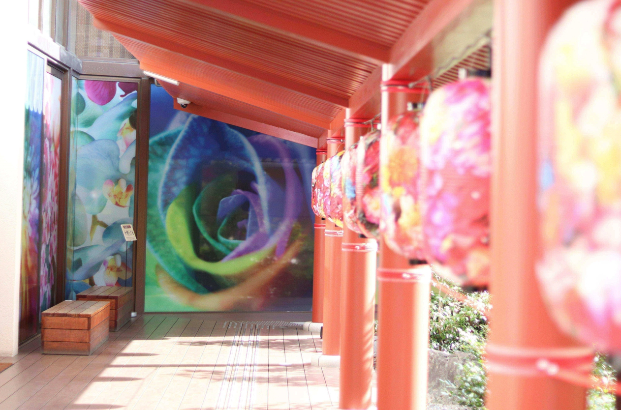 提灯を挟んだ回廊の壁にも、色鮮やかな花の写真が至るところに施されています。