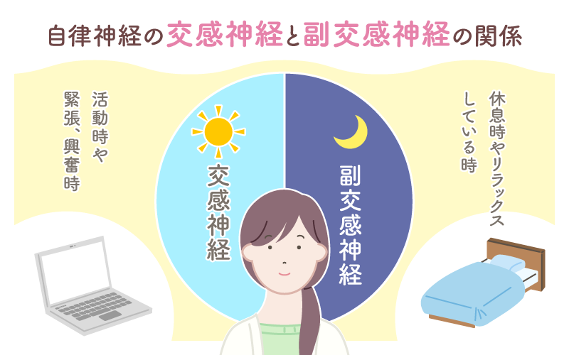 交感神経は活動している時に活発に働き、逆に寝ている時やリラックスしている時は副交感神経が優位に働きます。通常はこの2つの神経がオンオフを繰り返すことで自律神経のバランスを維持しています。