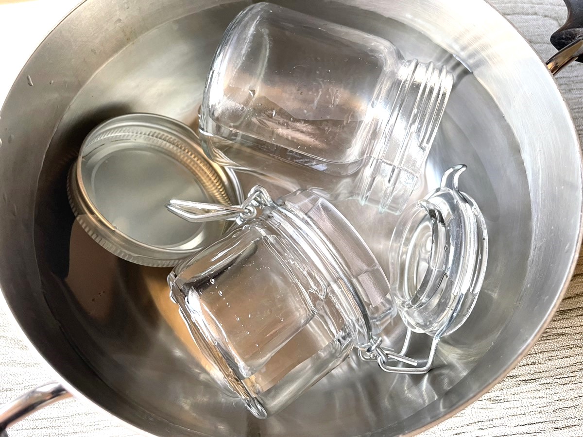 密封できるよう、耐熱ガラス製の清潔な保存ビンを使うのがポイントです。沸騰したお湯で10分ほど煮沸消毒し、清潔なふきんの上でしっかり乾燥させてください。