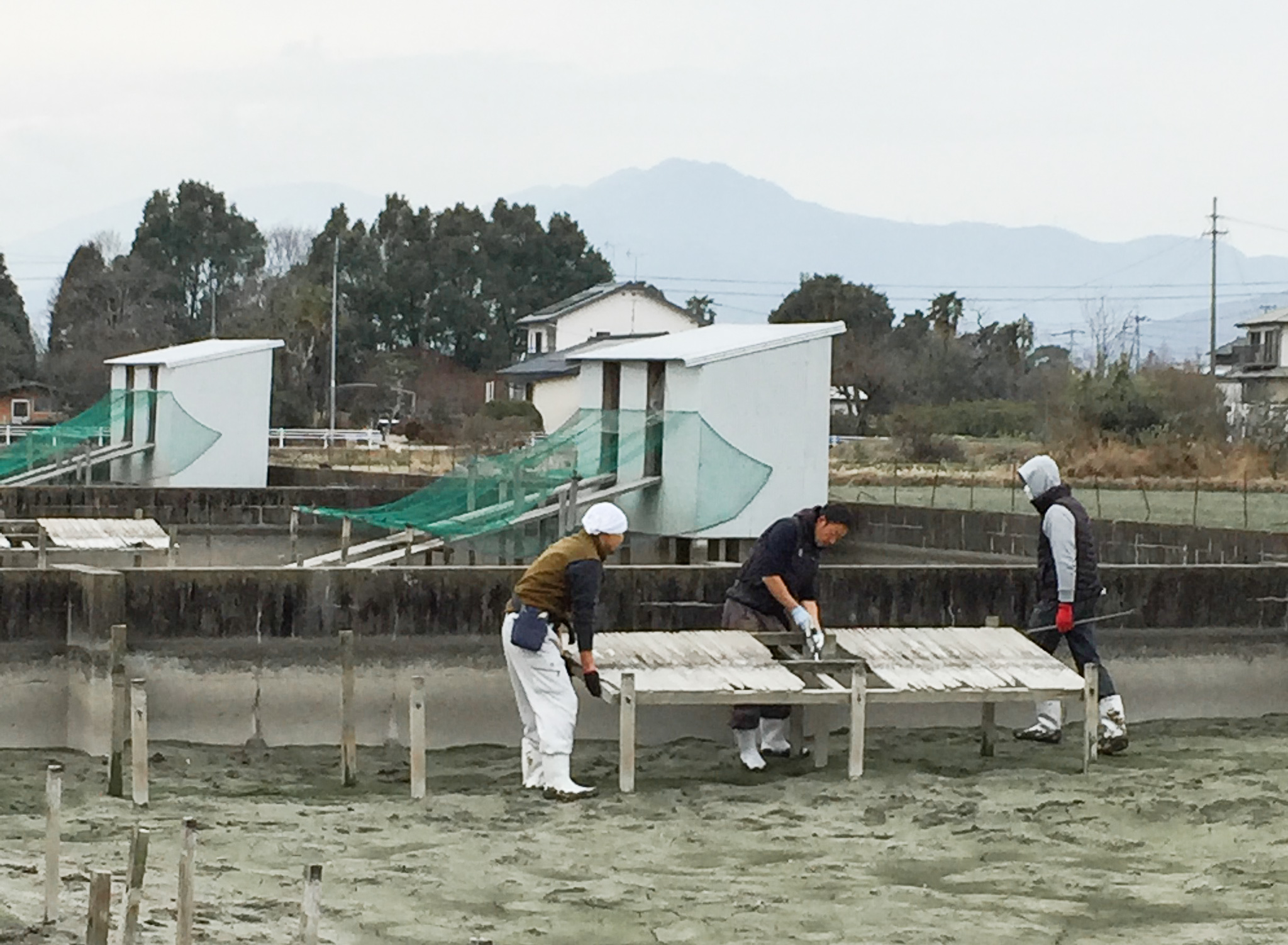今日の仕事をのぞき込むと・・この日は数日前から始まっていた数年に1度の大仕事!!5月末からの産卵に向けて、いけすの中の大改修と大掃除の作業です。