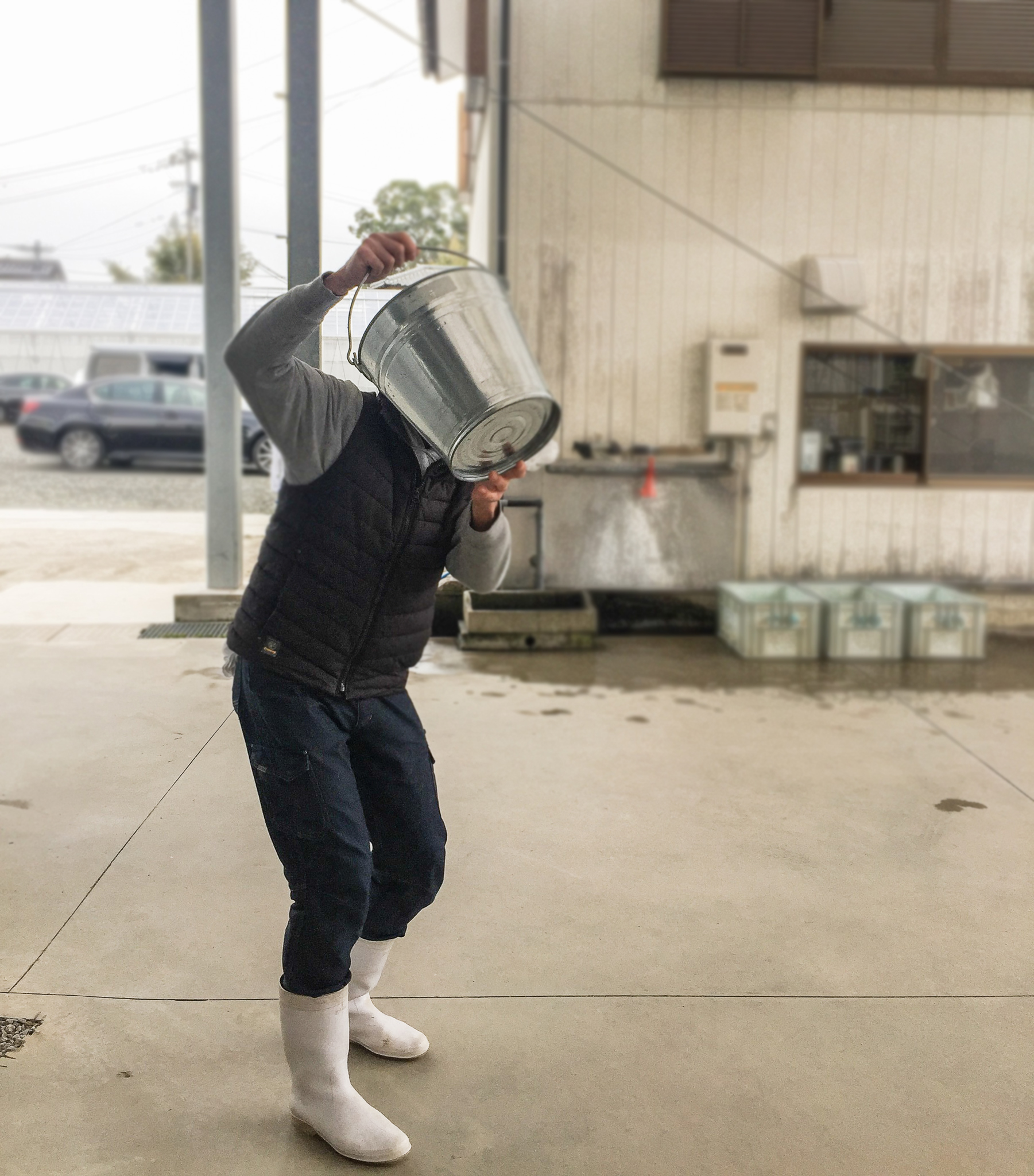 さて、今月最後にお届けするショットは、恥ずかしがりやのスタッフさんと、カメラ大好きミミちゃんです。訪問した翌日、ていねい通販新卒採用活動で学生さんが来社予定だったので、養殖場の様子を見てもらおうと、いつも以上にパシャパシャ撮っていたのですが、「恥ずかしいけん、撮らんで~!!」とバケツで完璧にお顔を隠されてしまいました。