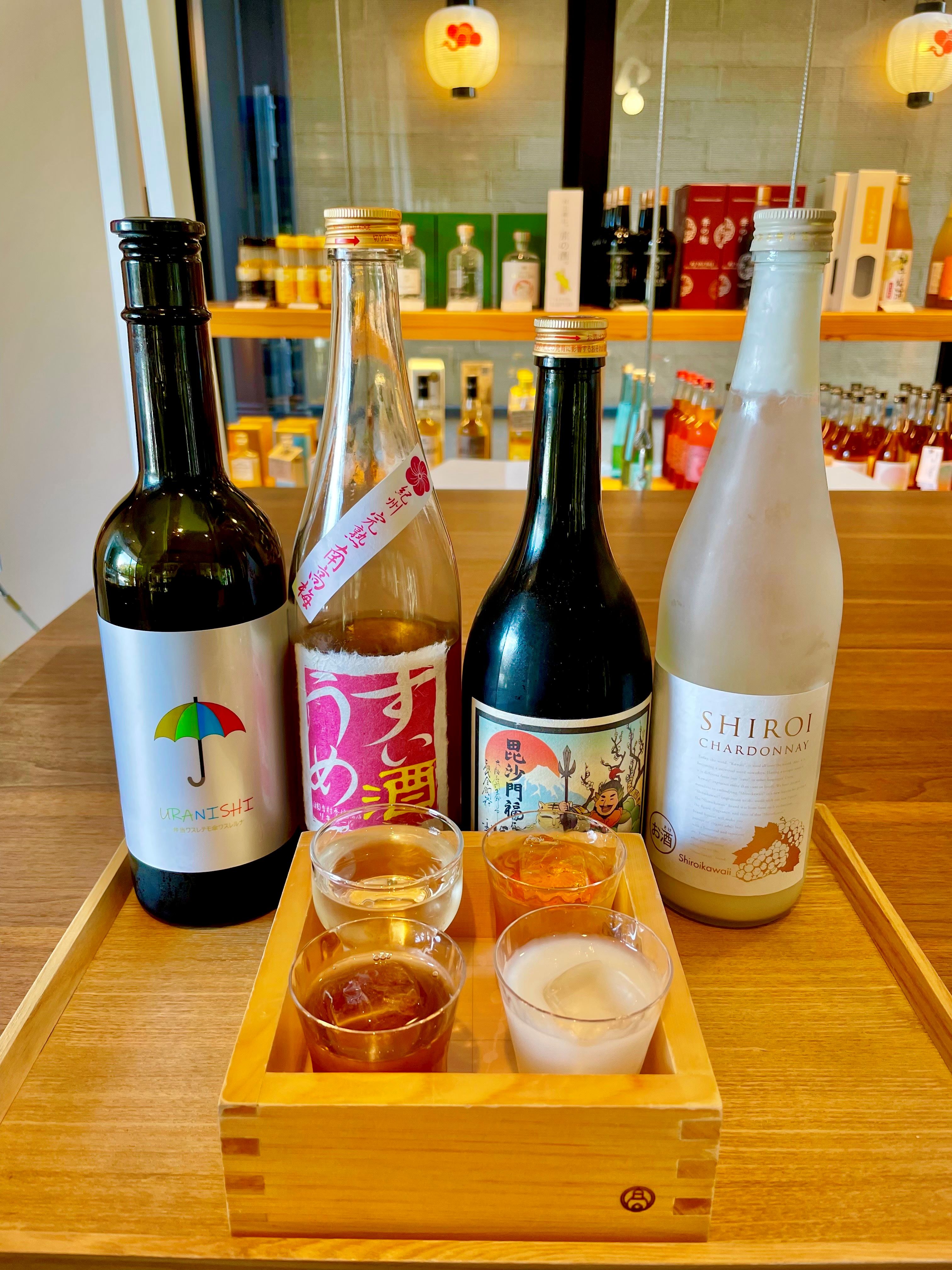 左から「もも梅酒」、「SHIROI CHARDONNAY(白いシャルドネ)」、「丹波 深山のぶどう」