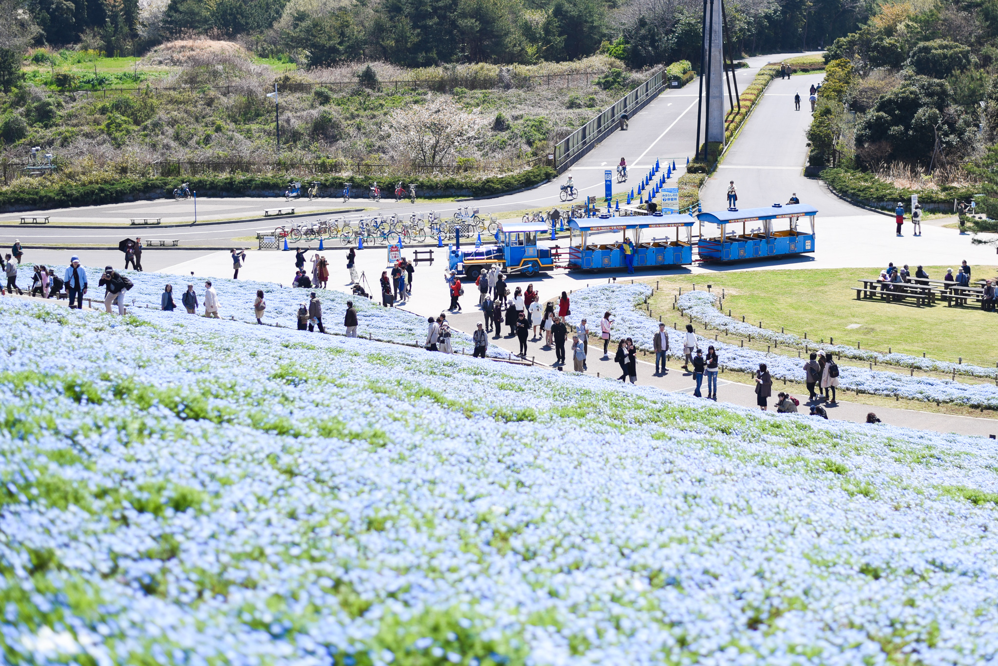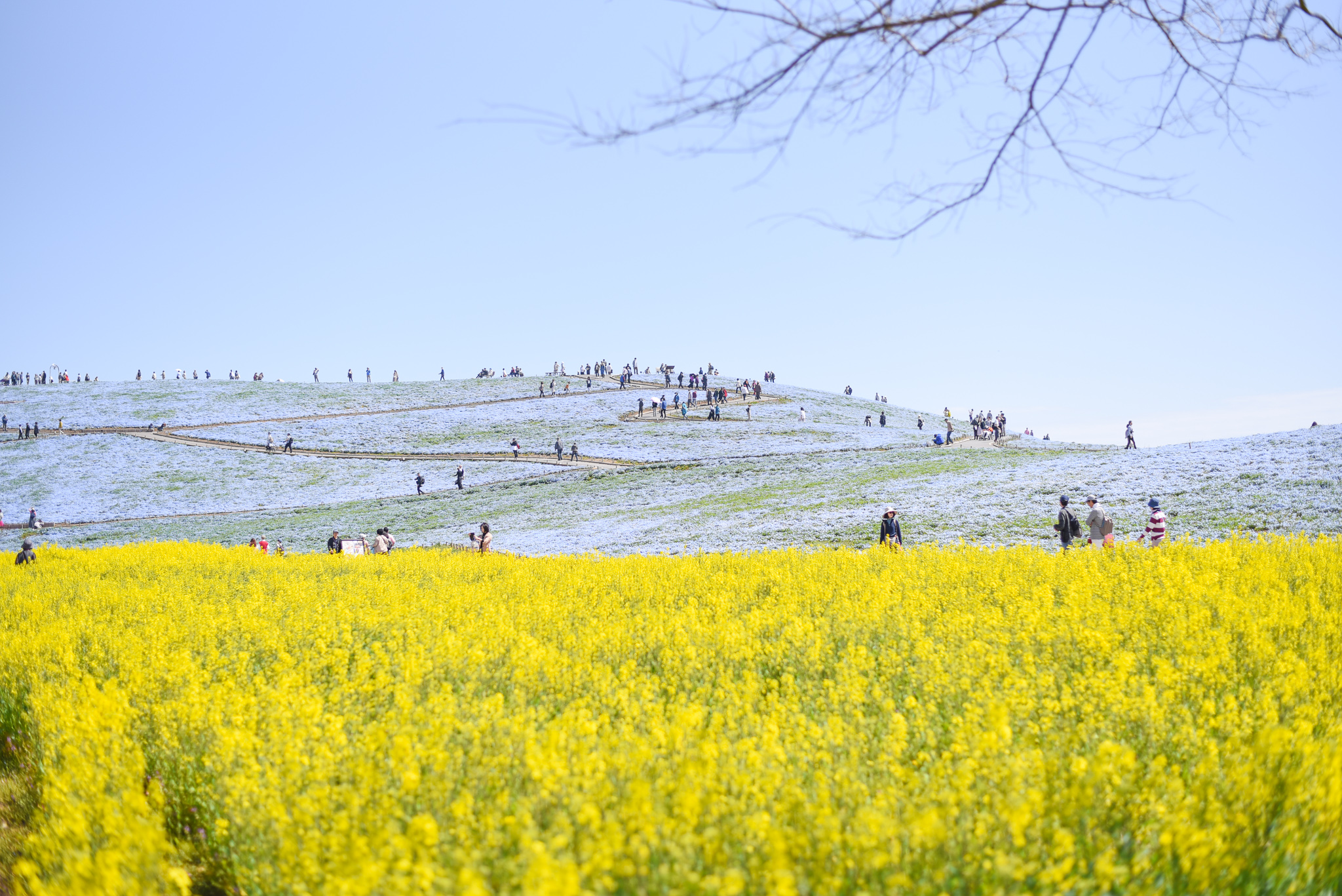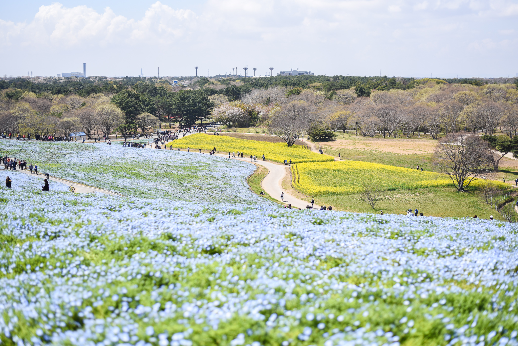 一面に広がる黄色の絨毯は菜の花です。そしてその奥には、空色で埋め尽くされた丘が見えます。こちらは“みはらしの丘”という丘です。