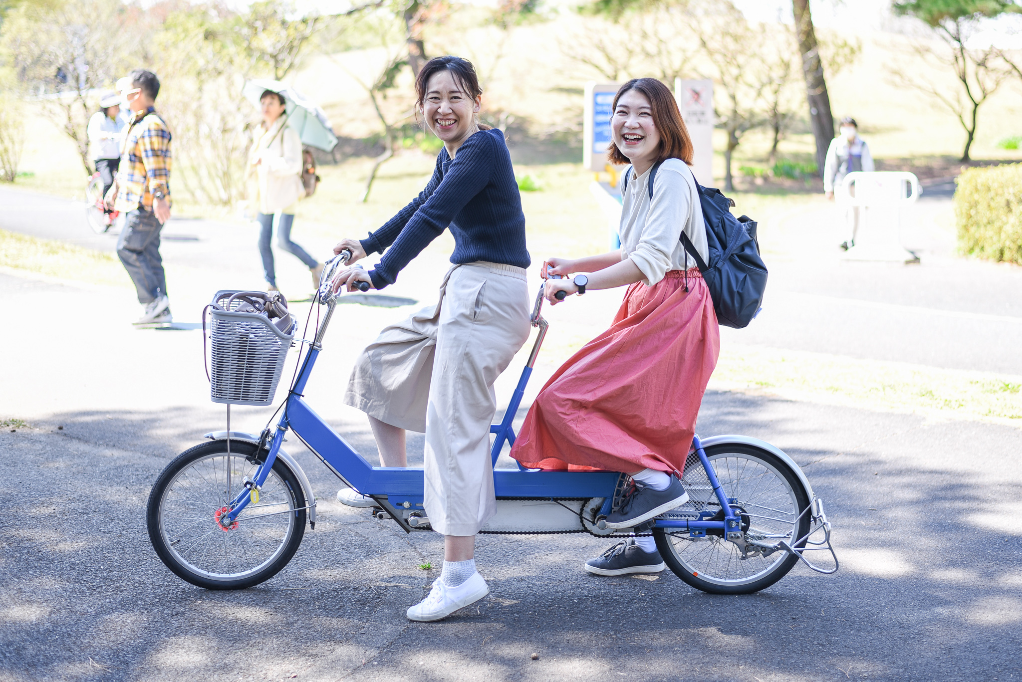 入ってまず向かったのは、レンタルサイクル!こちらの公園はとてもとても広いので、サイクリングコースが設けてあります。子ども用やお子さまを乗せることのできる自転車、大人2人乗り用の自転車まで。たくさんの自転車が用意されているのはうれしいですね☆わたしと池田が選んだのはこれです…!