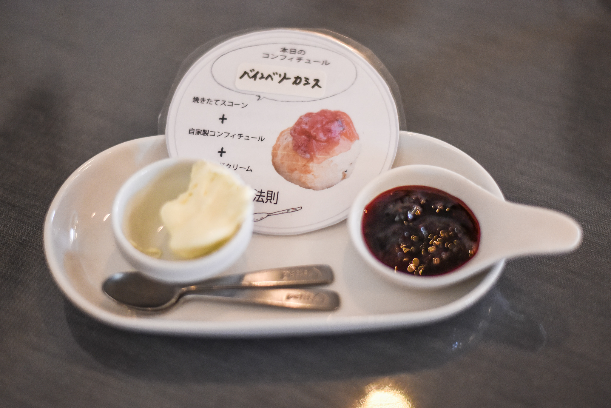お次に、たっぷりのコンフィチュールやクロテッドクリームをつけて。スコーン+コンフィチュール+クロテッドクリームが「スコーンの黄金の法則」とのこと。クロテッドクリームはバターのような生クリームのような味わいです。バインベリーのコンフィチュールは甘過ぎず、素材の味をギュッと凝縮していて濃厚。黄金の法則!間違いなしですね♪