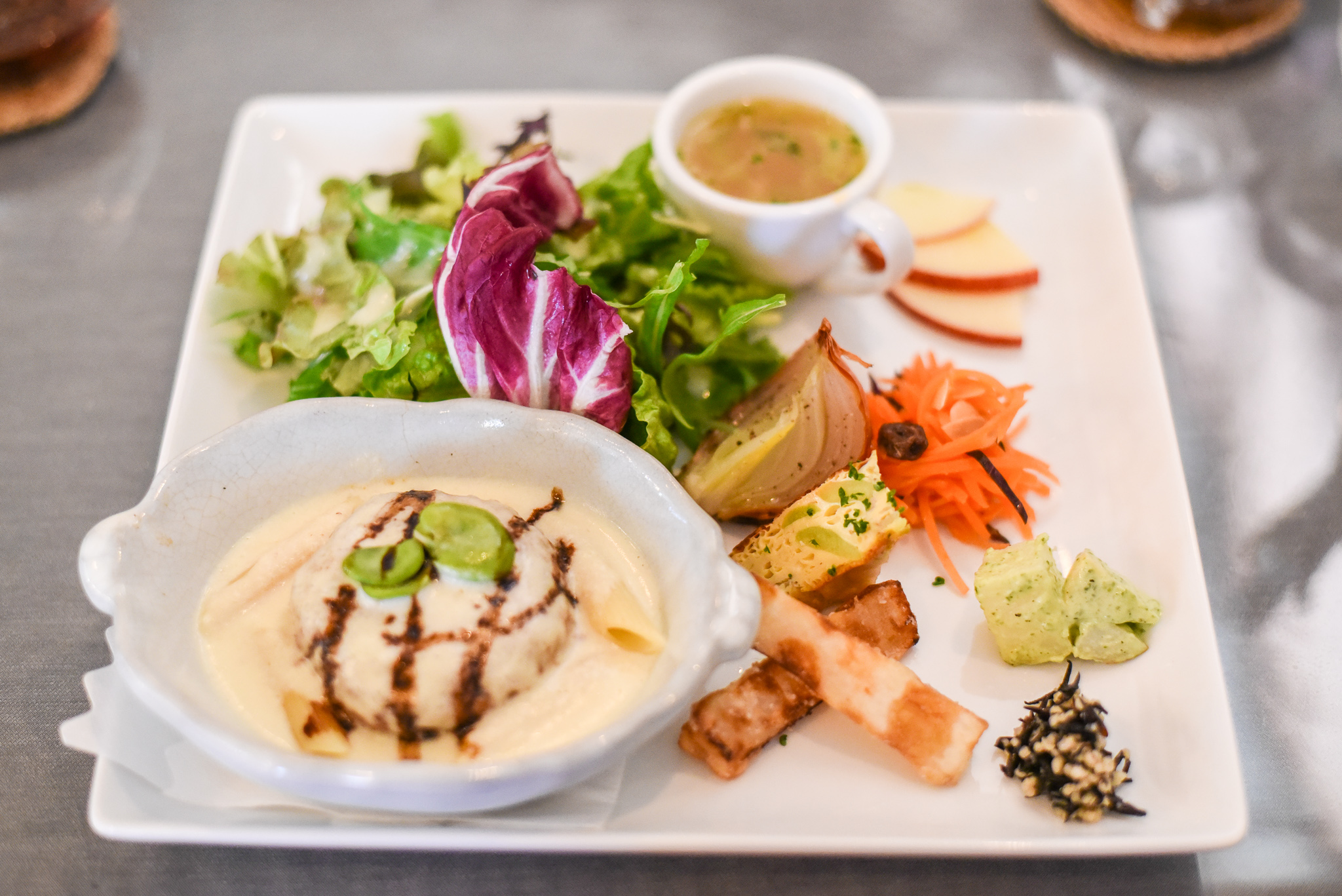 スコーンを4つペロッとたいらげたところで、お料理が運ばれていました。私が注文したのは“自家製ハンバーグ”です。ふんわり、でもしっかりとしたハンバーグに、たっぷりの新じゃがいものピューレがかかっていて、優しい味です。その周りにはたくさんのお野菜たち。どのお野菜も契約農家さんから届く新鮮なお野菜だそう。サラダはシャキシャキっとしていて、かつ歯ごたえがあり感動しました…!その他のお野菜も、素材の味を生かした調理をされています。たまねぎはブラックペッパーグリルされてあり、ピリッした辛みとたまねぎの甘みがマッチしています。
