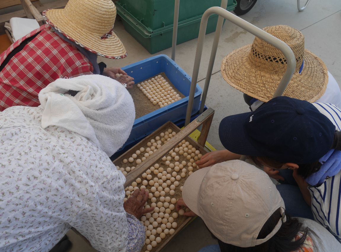 まずは今日産卵されたばかりのすっぽんの卵を収穫し、有精卵と無精卵の選別を行いました。選別を担当されているのは笑顔が素敵な92歳のベテランおばあちゃんです!