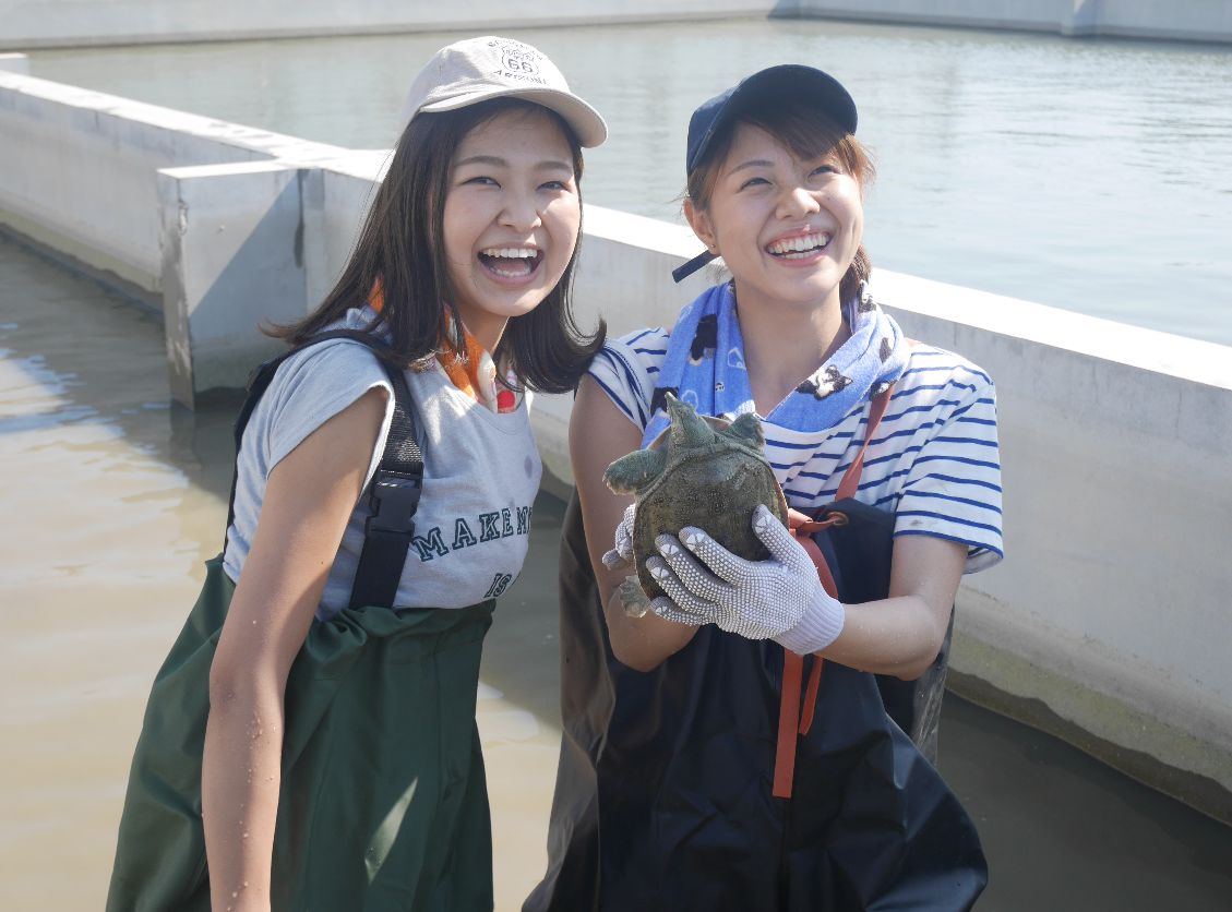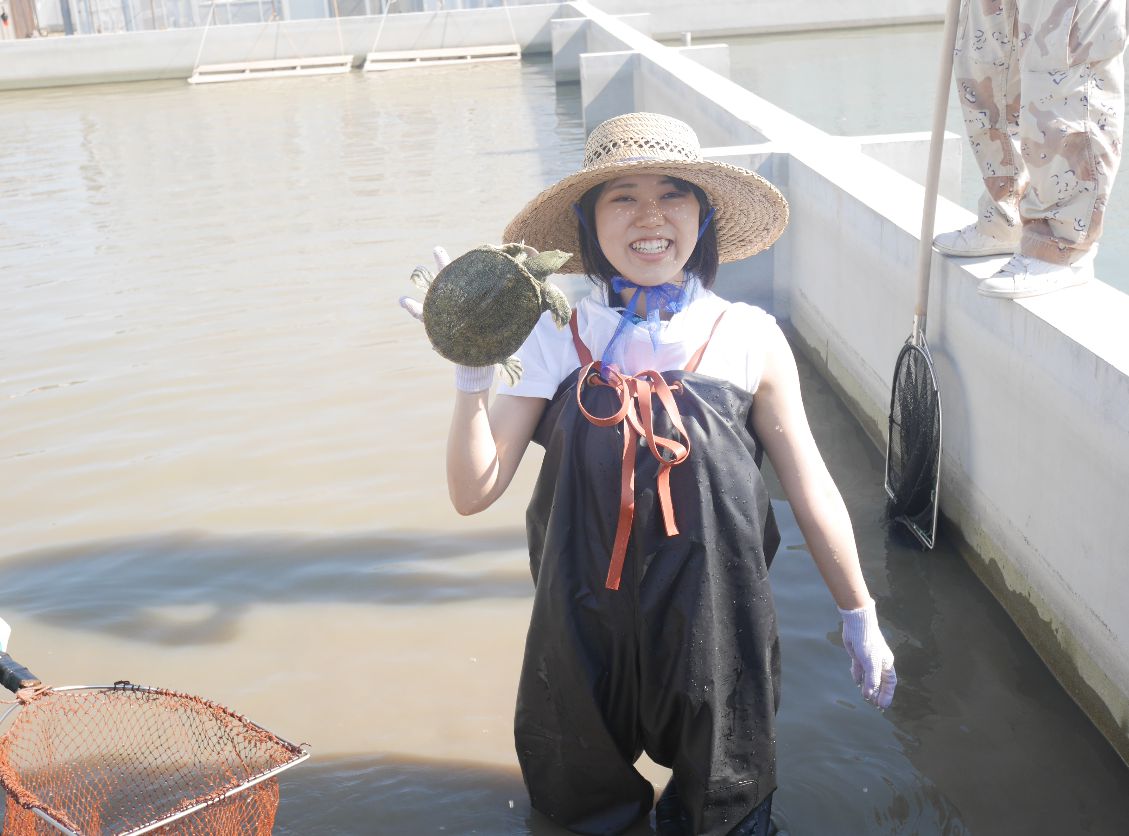警戒心が強いので、捕まえようとしてもすぐに逃げられてしまいましたが、養殖所の皆さんの手を借りながら、すっぽんに触ることができました。