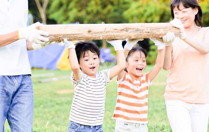 テントづくりや火おこしなど、家族で力を合わせることが必要なキャンプは、暮らしに必要な“住”と“食”を学ぶ場にもうってつけ。