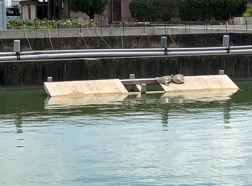 続いては外のいけすの様子をご紹介します。5月末頃から始まった産卵も半ばを迎え、久々のお天気が嬉しいのでしょうか、親亀達も気持ちよさそうに日向ぼっこをしています。