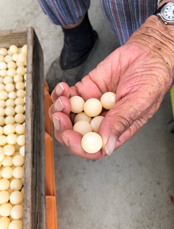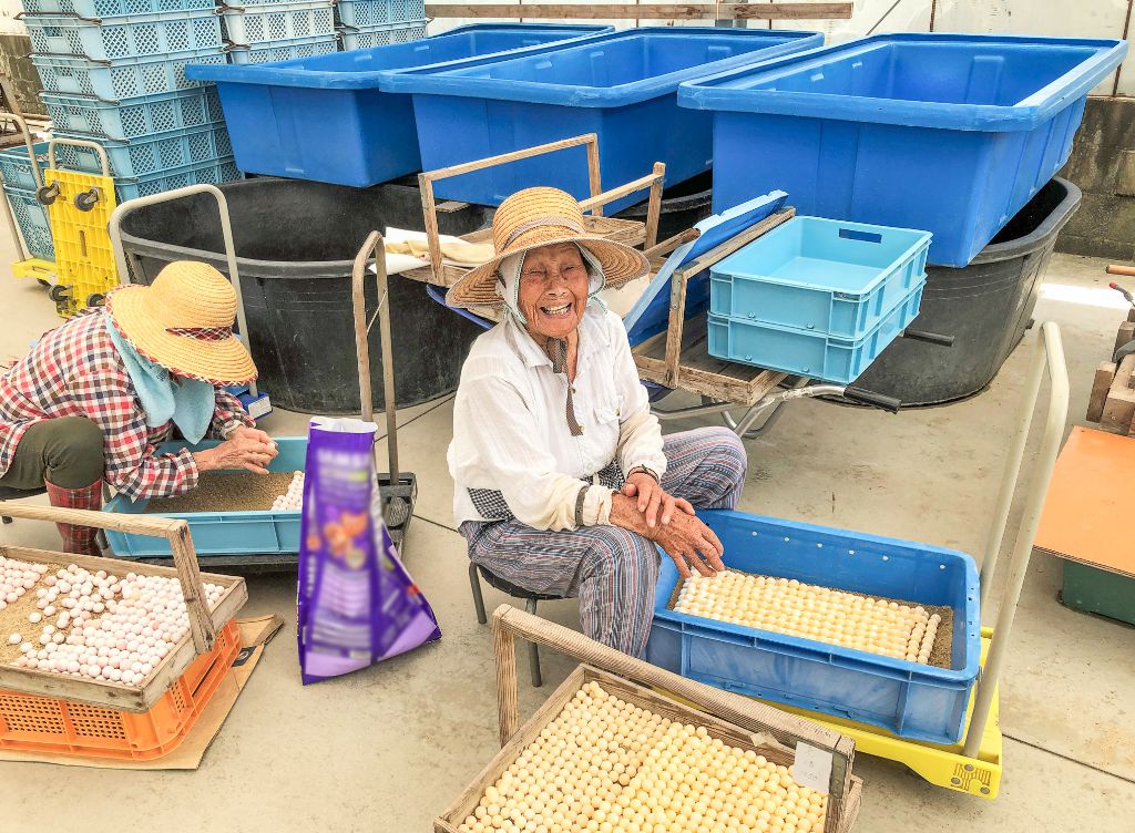 会いたかったよ~!おばぁちゃん♪と声を掛けると、とびっきりの笑顔で迎えてくれました~\(^o^)/産卵の時期は暑さに湿度も加わり大変な仕事ですが、誰よりもキビキビと有精卵と無精卵を仕分けしていく姿に元気を頂きました!92歳になられたおばぁちゃん、まだまだ現役バリバリです!