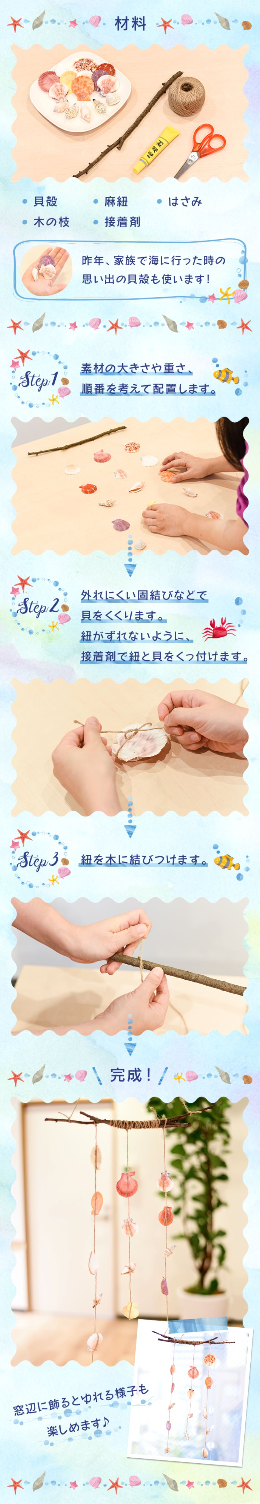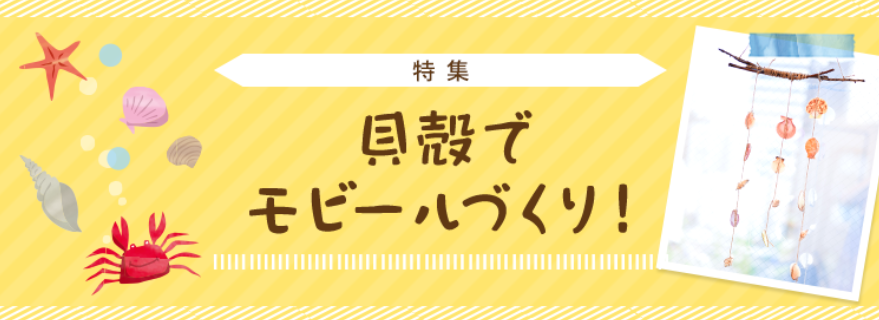 今回の特集は、貝殻で作るモビール(飾りもの)をご紹介します♪ご家族やご友人たちと海に行った時の思い出をカタチに残してみませんか☆