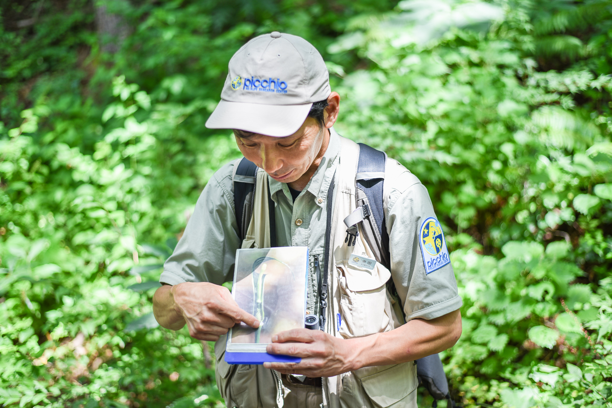 前置きが長くなりましたが…それでは早速ネイチャーツアーに出発!今回担当してくださるのは桒田(くわた)さま。「 は~い!!今日はよろしくお願いします~!!」元気な声で参加者の気持ちを上げてくださいます☆服の腕にあるマークはピッキオさんのマークです。ピッキオとは、イタリア語で「キツツキ」という意味のあるそう*