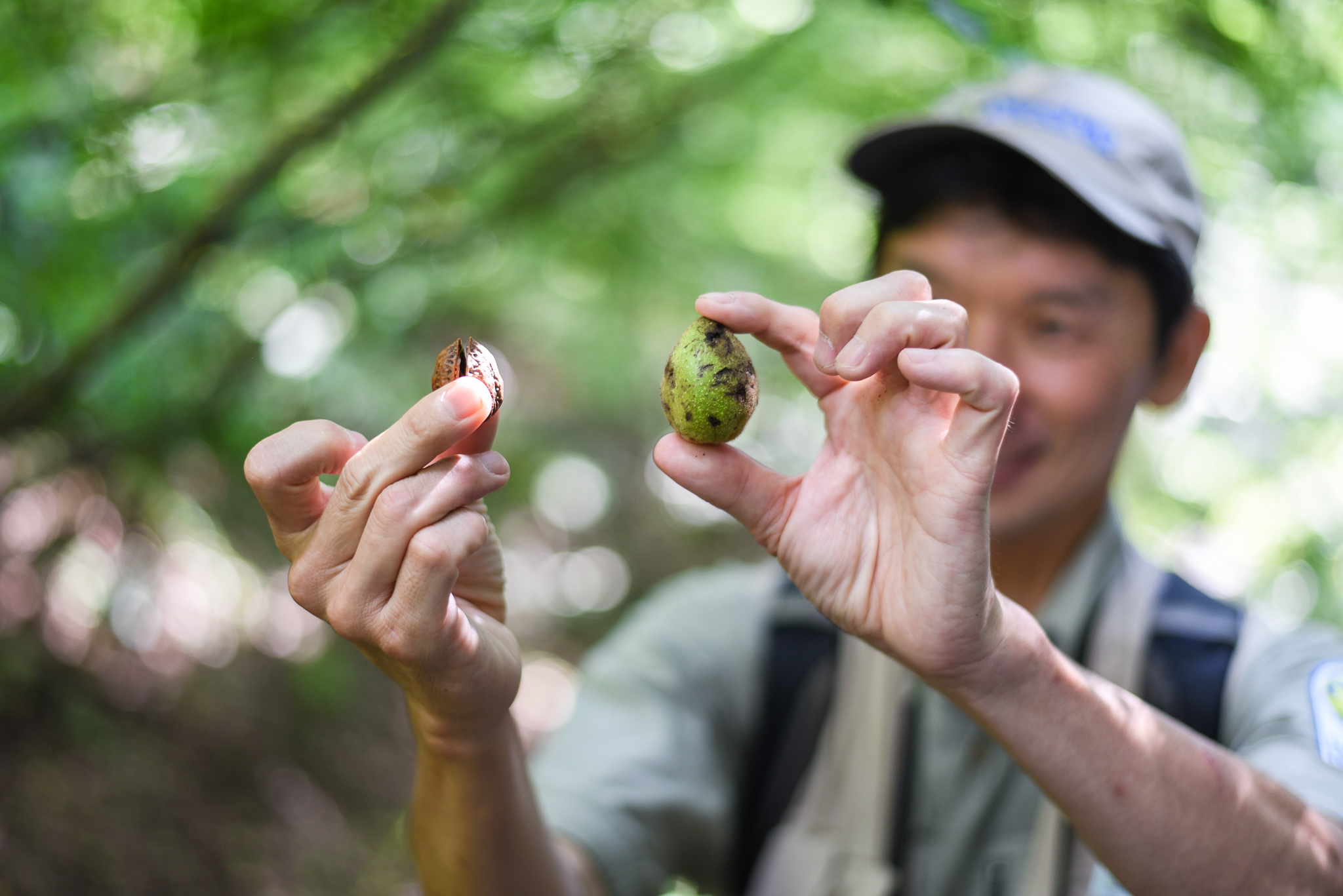 こちらの木にはあのツキノワグマが登った後の爪痕が残っていました。ツキノワグマが大好きな実のできる「ウワズミザクラ」の木だそうです。そこででました!桒田ファイル☆ ツキノワグマの食べる食材を説明をしてくださいます。基本、木の実や山菜などを食べていて、時々ハチやアリを食べているそう(*゚o゚*) 「鮭は!?人は!?と思うかもしれませんが食べません!こういったものを食べているんですよ(*^^*)」と桒田さん。元々は雑食な生き物なんですね。