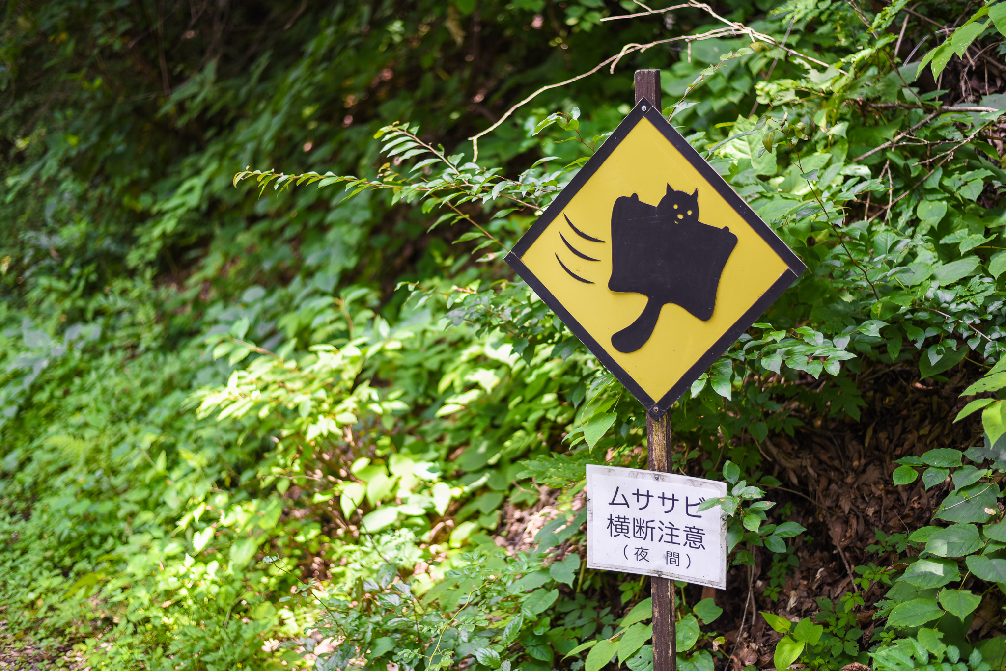 車を止めて緑に囲まれた道を上っていく途中に…ムササビ注意の看板が!!しかも手作り感満載でとってもかわいらしい♪夜はムササビがこの道の上を飛んで横断するんですね!