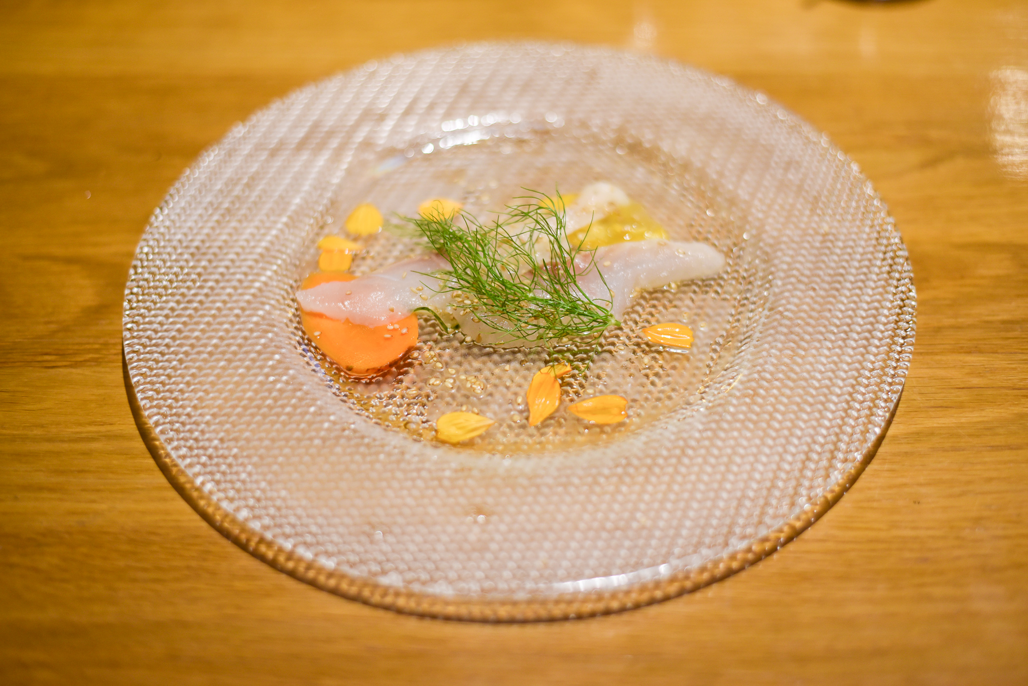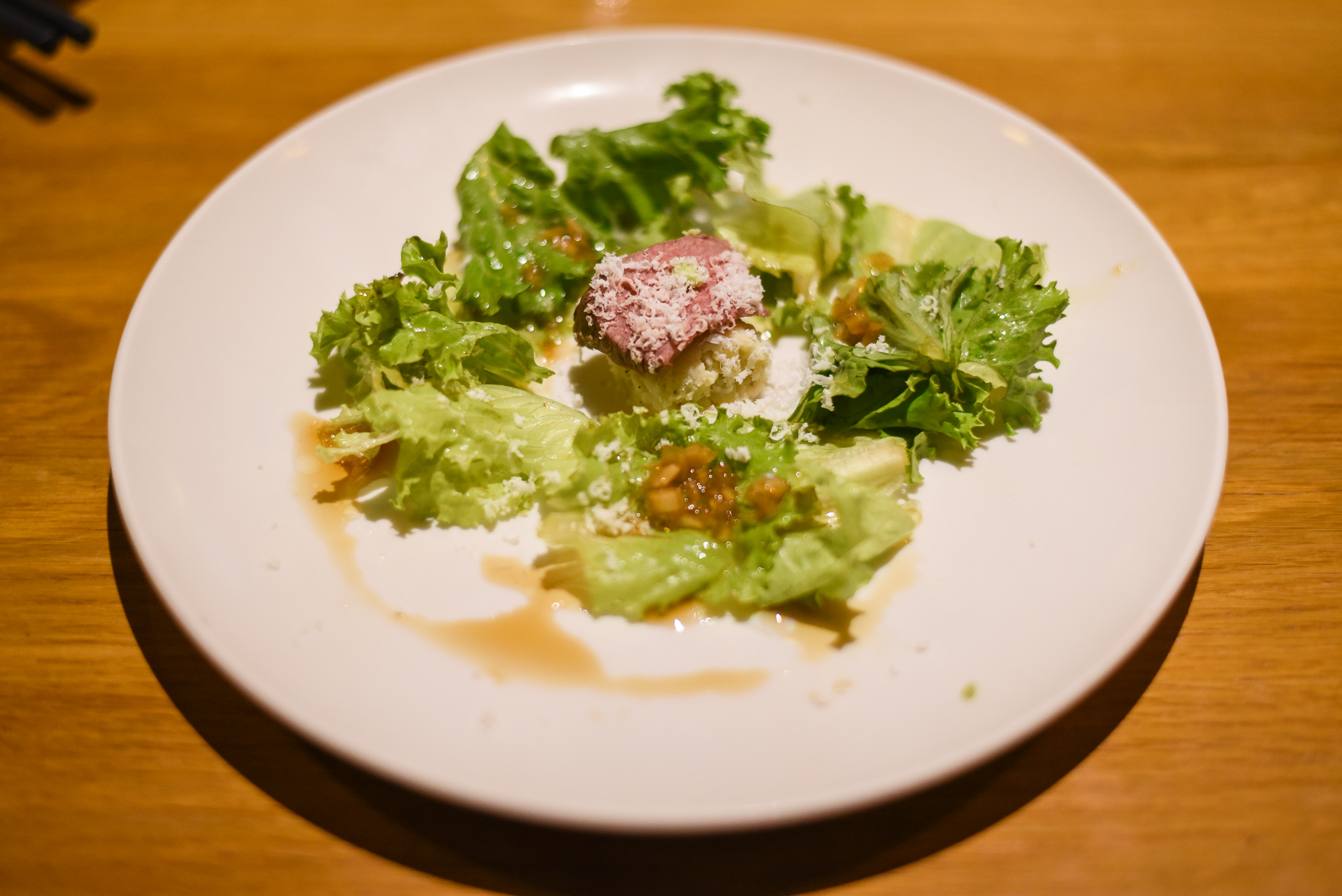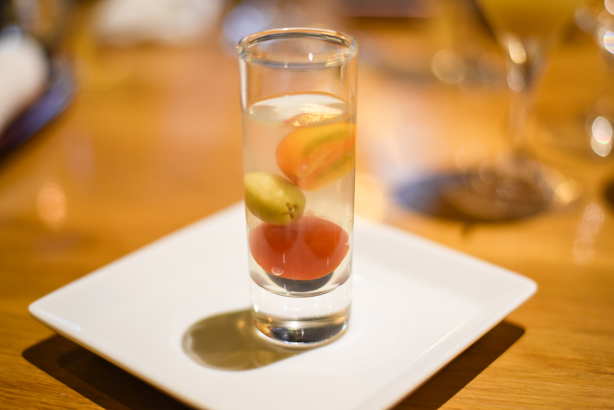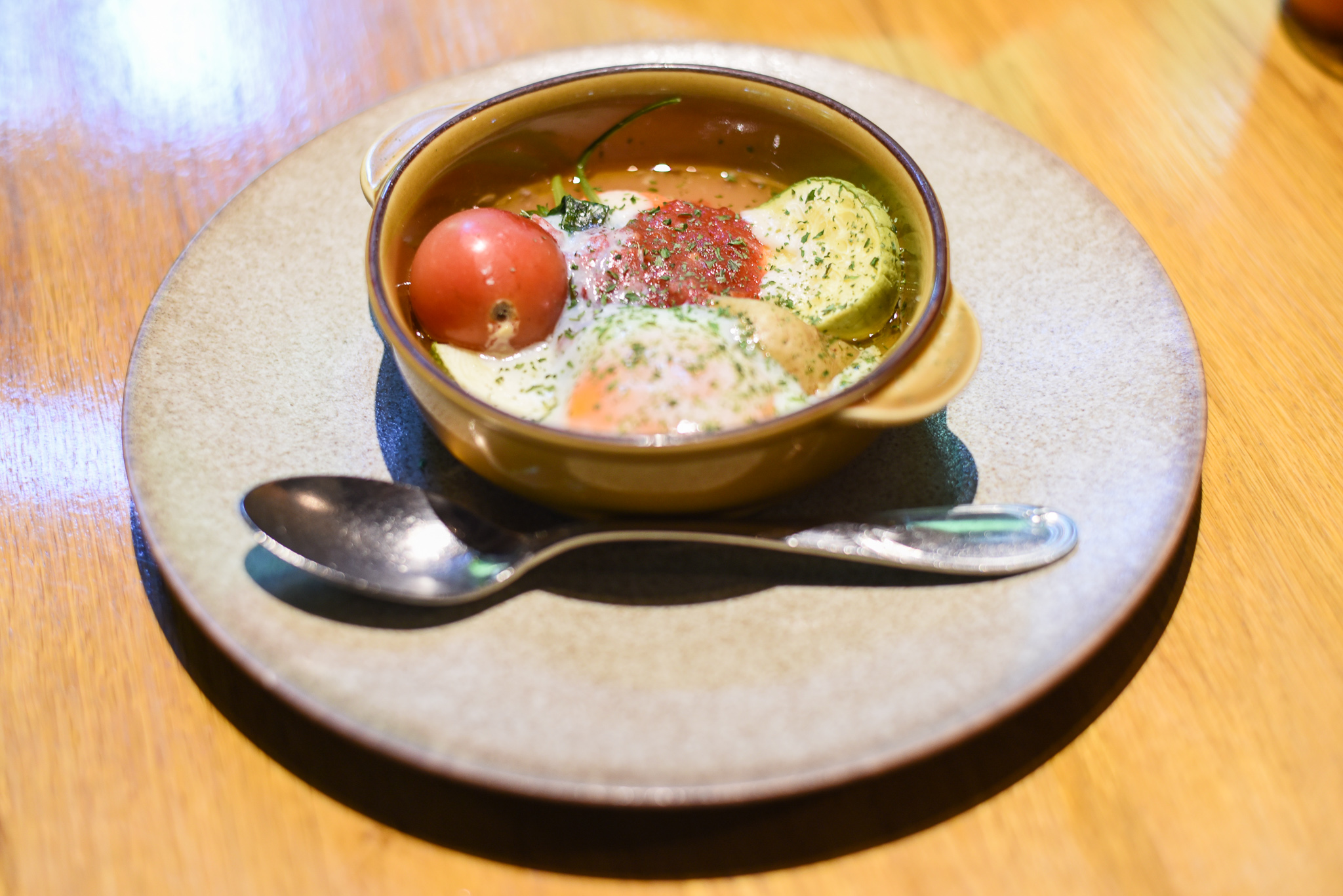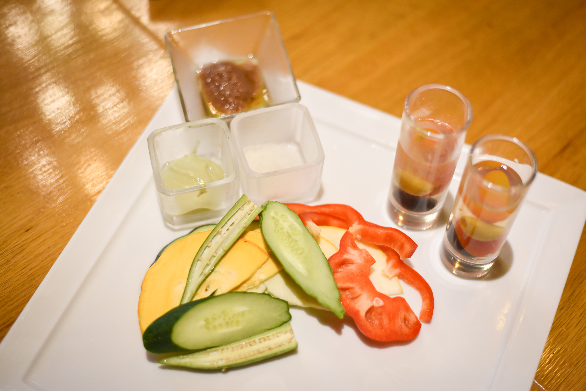 まずはお野菜が運ばれてきました。バーニャカウダーとお野菜のジュレです。お野菜はきゅうりやおくら、コリンキー、ズッキーニなど色とりどりの夏のお野菜が並びます。ソースは『信州みそとクルミ』『ほうれん草と豆乳』『塩』の3種類ご用意いただいたので、色々な味を楽しむことができます♪