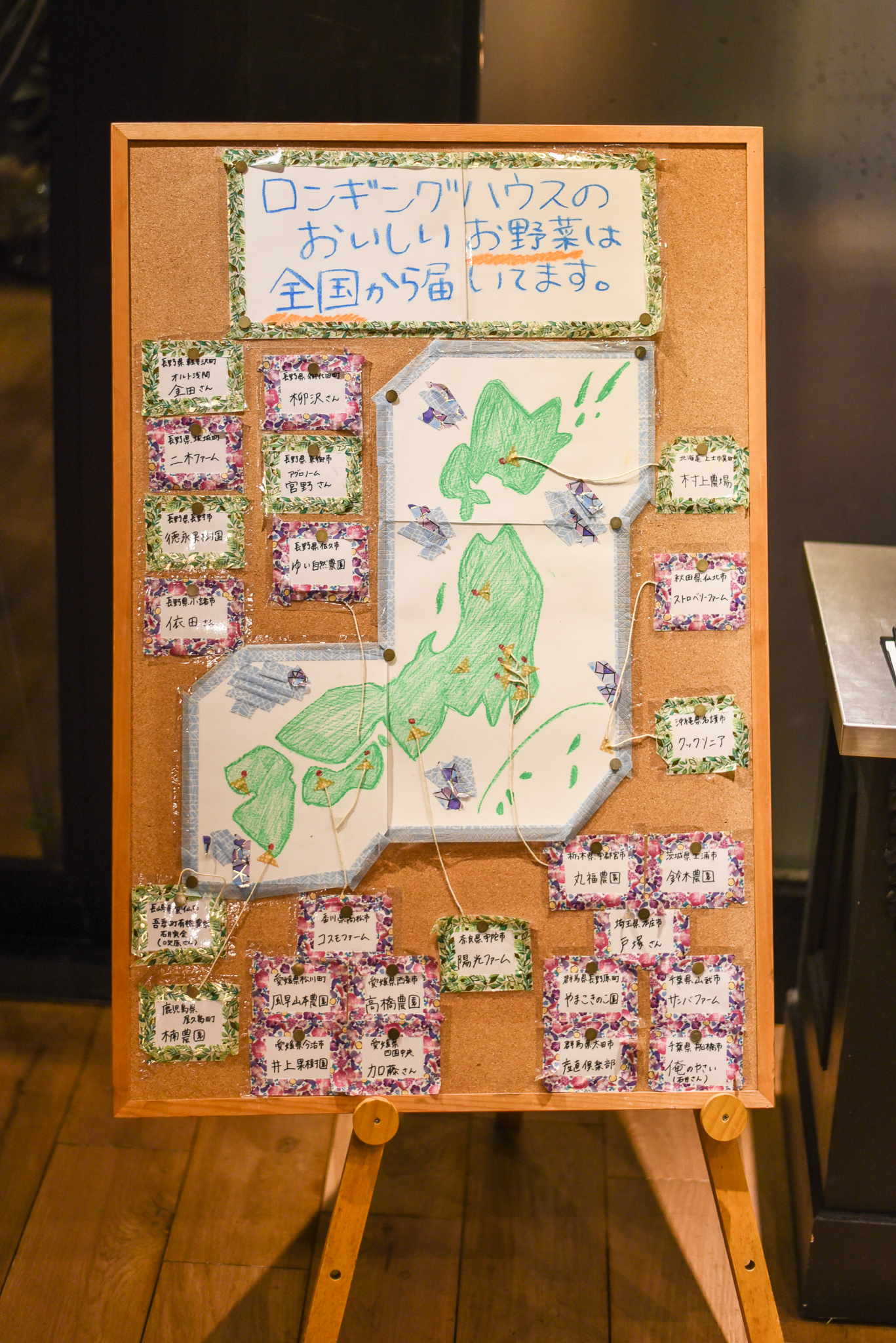 入り口はこんな看板がありました!総料理長さんが、全国各地の農家さんを訪ね歩いて、選りすぐりのお野菜を取り寄せておられるそうです☆農家さんの畑のお手伝いに行くことも。農家さんとの関係性をとても大切にされているのがステキですね。本当においしいお野菜を提供したい。その想いをとても強く感じます。