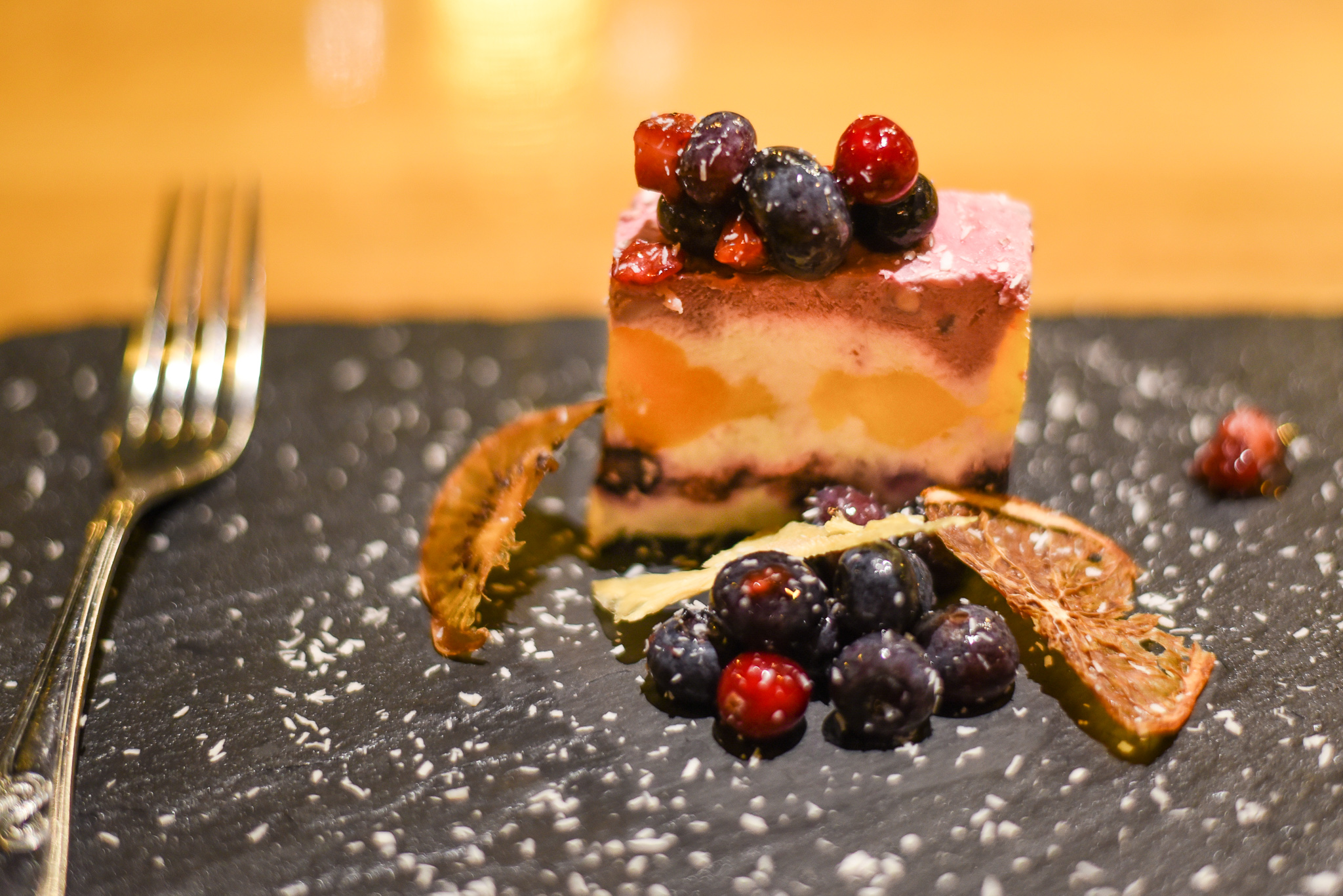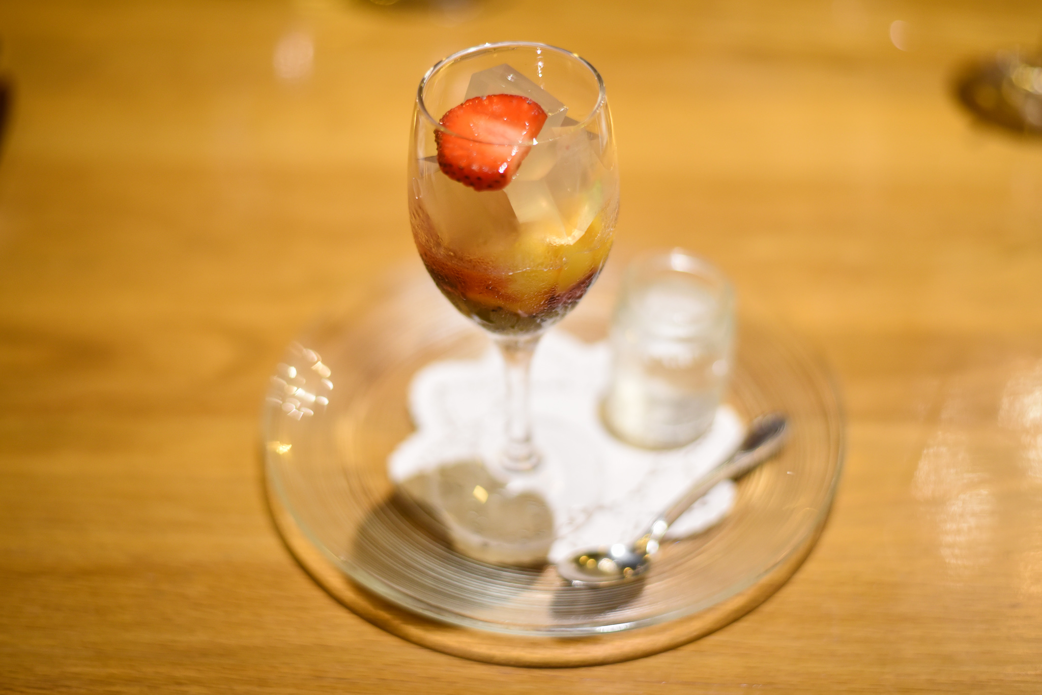最後はデザートです。「フローズンフルーツとゼリーのスイーツ」。別添えしてある炭酸水をグラスに入れていただきます。シュワシュワと合わさった炭酸とフルーツや寒天でさっぱりといただけました(*^^*)