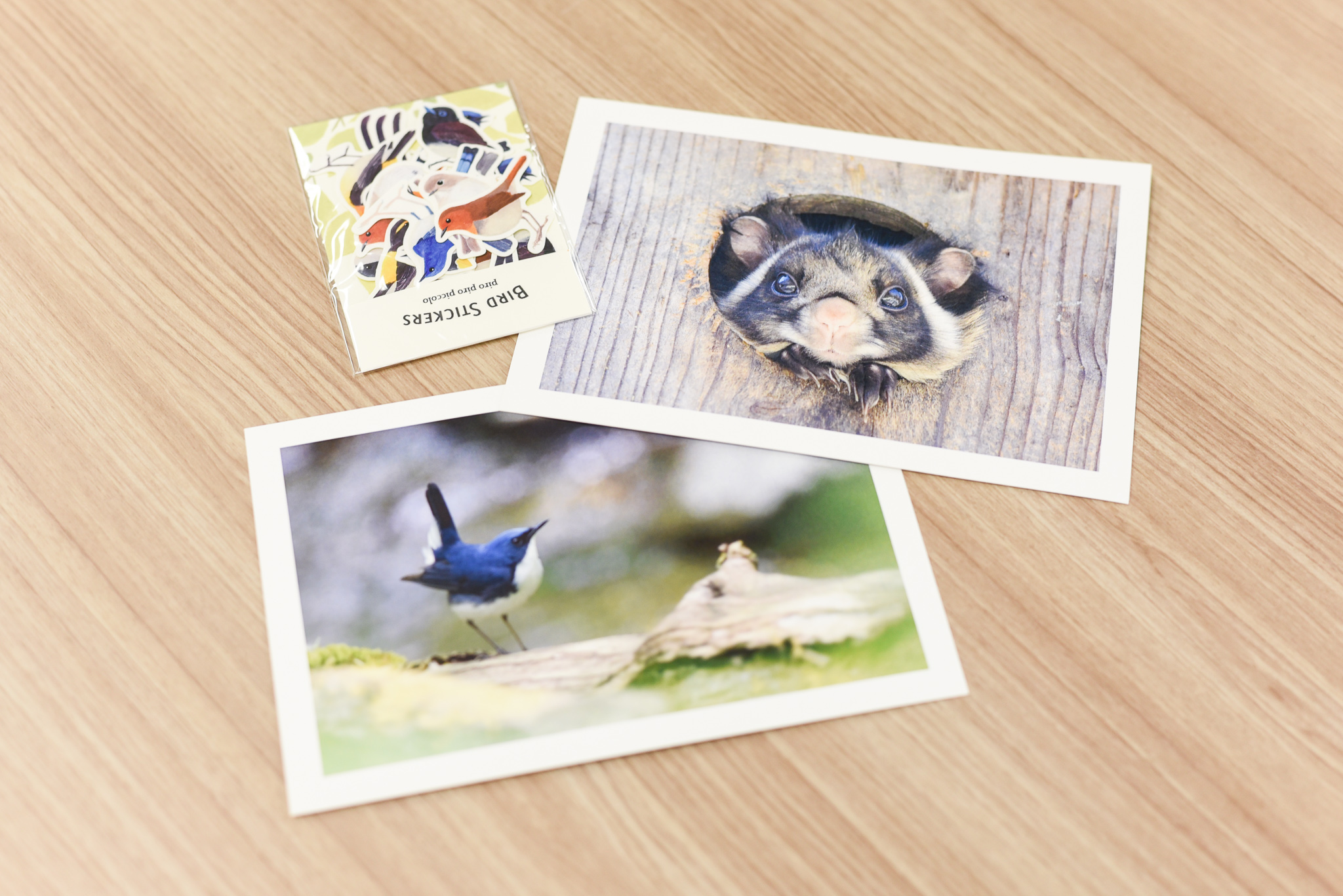 今回の尾中からのおすそわけは…「ピッキオ」さまで販売されておりました、ポストカード2種といろいろな種類の鳥のシールです。こちらを3名さまにプレゼント★かわいい“ムササビ”がみなさまからのご応募をお待ちしております♪