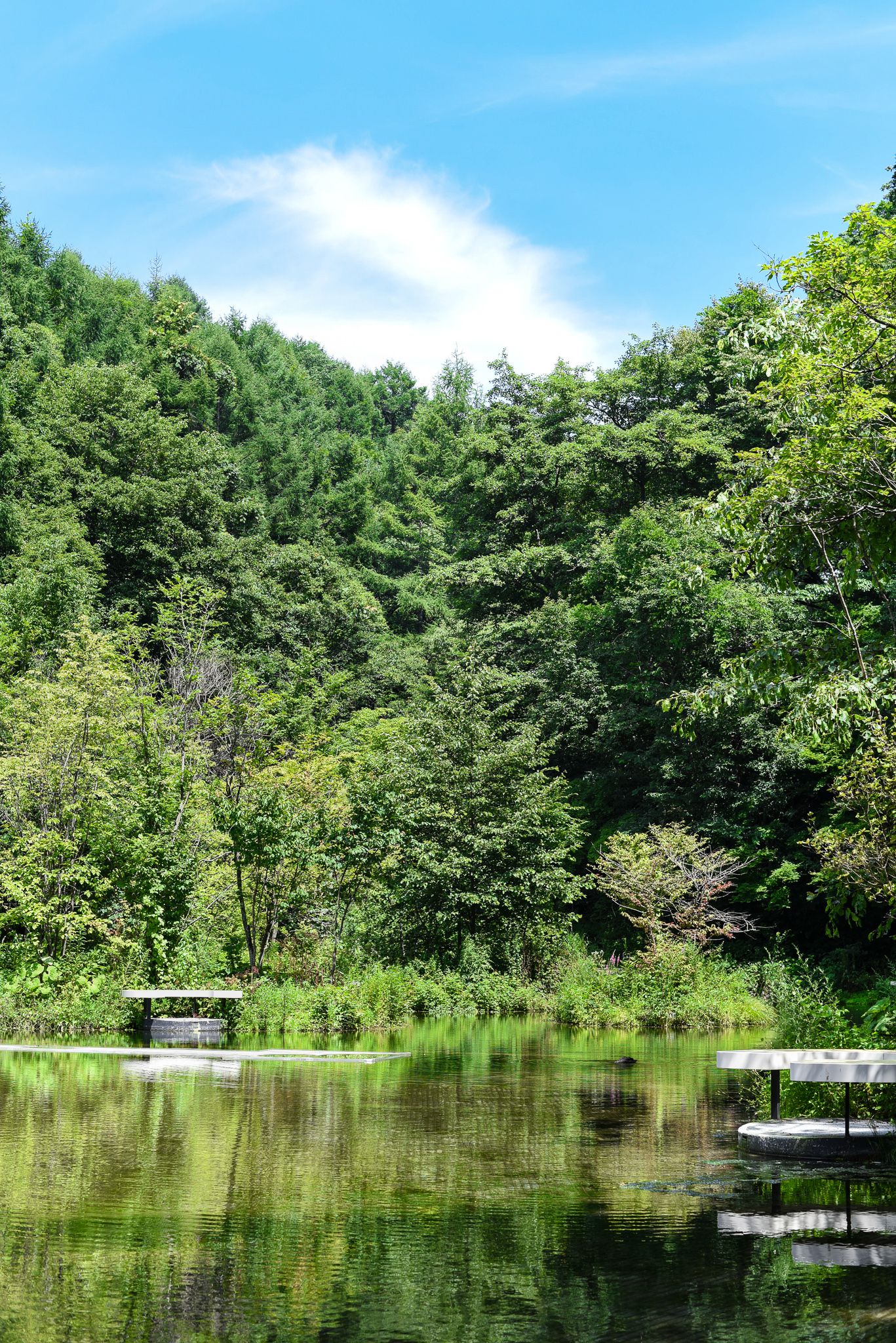 受付には開放的なテラスがあり、その前に丸い大きな池。そしてテラスと池をぐるっと背の高い木々が囲んでいて、上を見上げると青空が抜けてみえます。水面に青空が映っていて、とてもキレイです。心地よい風と、鳥の鳴き声が心も体も癒してくれます*