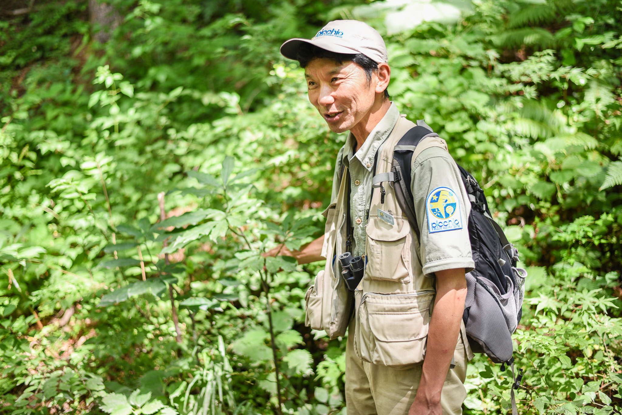 双眼鏡でバードウォッチングしながら進みます。静かに鳥の鳴き声をききながら「これは〇〇という鳥の鳴き声ですよ」と、桒田ポケットから次から次へとでてくる鳥の図鑑を見せてくださいながら教えてくれます。静かな森に鳥たちのかわいい声と、風に揺れる木々の音が響きわたります。