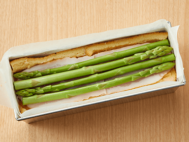 中段と側面に耳を敷き詰め、ベーコン・アスパラガス(穂先と根元を交互に並べる)・クリームチーズ・トマト・ブラックペッパー・粉チーズ(1/3量)の順に重ねる。上から食パンをかぶせ、残りのタマネギ・粉チーズ(1/3量)をトッピングする。