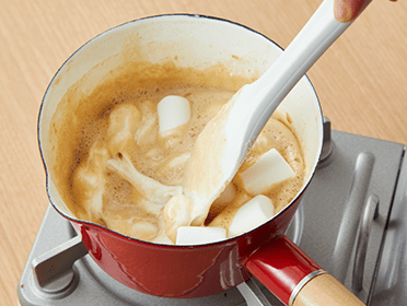 マシュマロを加え、ヘラで混ぜながら溶かし、溶けたら残りの牛乳を加える。