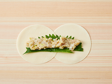 〈花びら餃子〉 皮2枚を並べ、端と端を少し重ねてくっつける。中央に大葉を横並びに置き、あんをのせ、上端から7~8mm手前の所で合わせるように折りたたみ、横端からクルクルと巻いて留める。