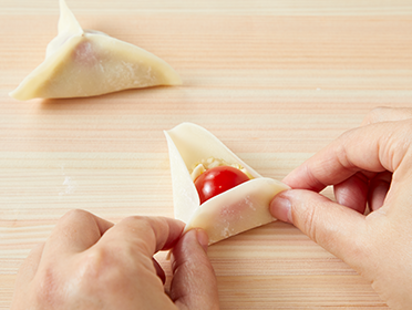 〈三方餃子〉 皮の中央にあんをのせて、上からモッツァレラチーズ(半量)・トマトをギュッと押し込み、皮のふち2箇所を中心に向かってつまみ、残り1箇所からも同様につまむ。