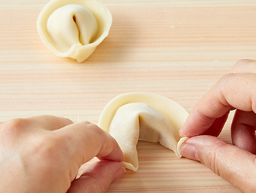 〈帽子餃子〉 残りのあんにカレー粉・残りのモッツァレラチーズを混ぜる。皮の中央にあんをのせて、半分に折ってふちをくっつけ、両端をくっつける。