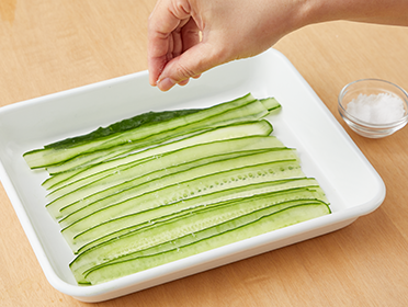 キュウリはピーラーを使ってリボン状にスライスする。塩をほんの少し振り、しばらく置いて水気をよく拭き取る。