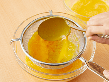 〈A〉をあらかじめ混ぜ(1)に混ぜ入れる。ザルで漉して口当たりをなめらかにし、耐熱容器の8分目くらいまで入れる。