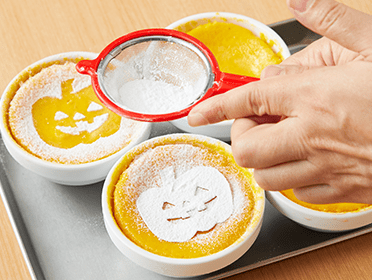 (4)を冷蔵庫で2時間ほど冷やし、食べる直前に粉糖をかけてデコレートし、カラメルソースを添える。